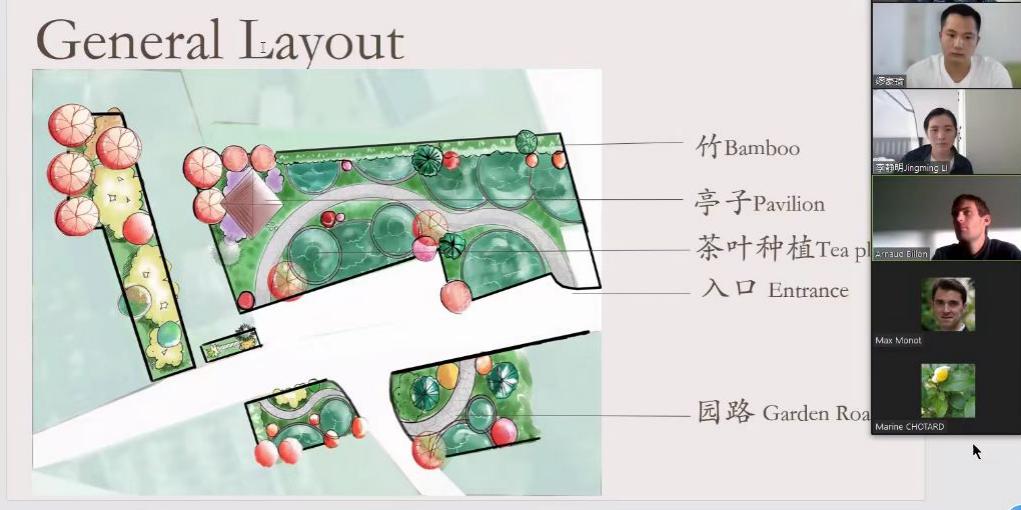 近日,艾内邦中法友谊园设计比赛的决赛以线上汇报的形式开展,法国农业部中法农业教育合作主任马克斯、艾内邦农业学校农场总经理Arnaud Billon、艾内邦农业学校茶业项目经理Marine Chotard、我院章广明、于坤、周晓春老师、国际教育色花堂