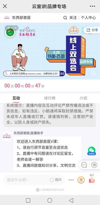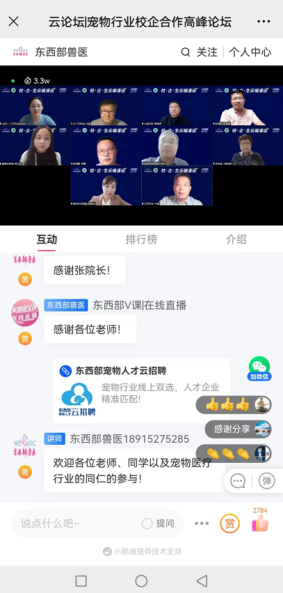 承办的“校·企·生云端漫话”系列活动圆满收官。该系列活动自5月22日拉开序幕,由一场“云论坛-宠物行业校企合作高峰论坛”、两场“云沙龙-校企共话人才成长”、两场“云招聘-企业专场宣讲会”共五场活动组成,此次活动得到了50多家院校师生的广泛关注,直播间访客数超10000人,直播间浏览量超30000次,最热烈的一场活动热度超过30万。