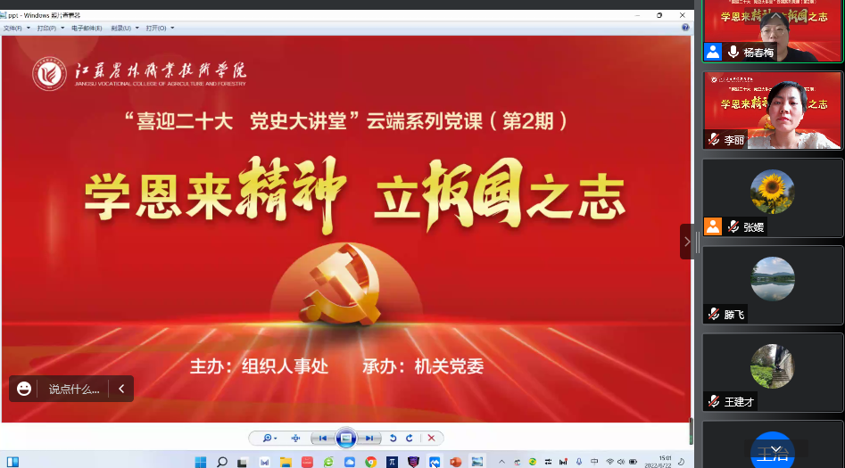 为持续加强党史学习教育,着力推进党史教育常态化。6月22日下午,机关党委组织了“喜迎二十大党史大讲堂”云端系列党课(第二期)活动,邀请组织人事处副处长、副教授李丽作《学恩来精神立报国之志》主题党课,机关党委近140名党员干部参加了本次活动。