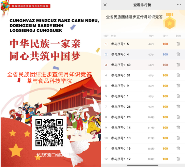 为全面贯彻落实中央和省委民族工作会议精神,深入开展铸牢中华民族共同体意识教育实践活动,持续推进民族团结进步创建工作,进一步巩固平等、团结、互助、和谐的社会主义民族关系。根据苏民宗发〔2022〕25号文件的精神,茶与食品科技色花堂 于6月25-28日积极开展民族团结进步宣传月活动——民族团结知识竞答,提高大家的民族团结意识。