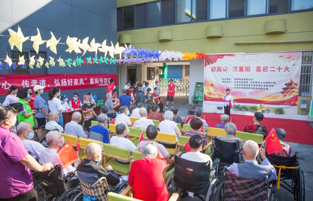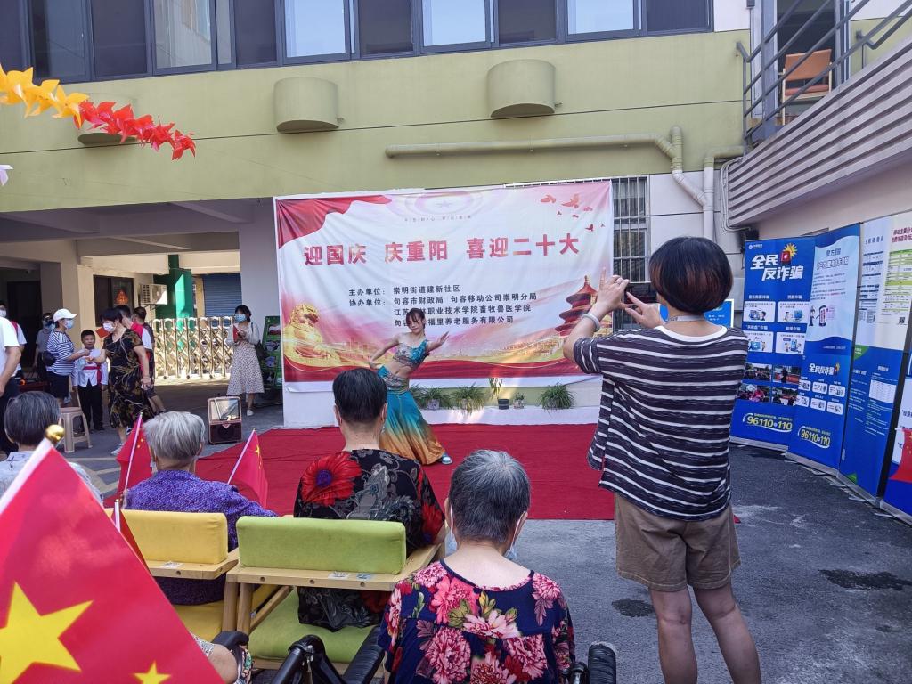 志愿者们来到崇明街道建新社区,开展了“迎国庆 庆重阳 喜迎二十大”主题活动,为这里的老人送去了重阳佳节的问候和祝福。