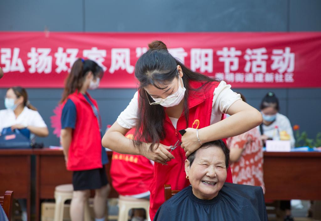 义剪志愿者们准备好凳子、各种理发工具,热情地为老人们免费理发。志愿者们耐心地与老人进行沟通,细心认真地为老人修剪出满意的发型。