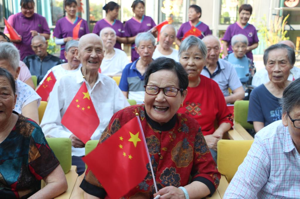 的表演者载歌载舞,现场气氛热情欢乐。大家兴高采烈地挥动手中的国旗,一起合唱《我爱你中国》共祝祖国繁荣美好,祝愿老人健康长寿、幸福永远。色花堂