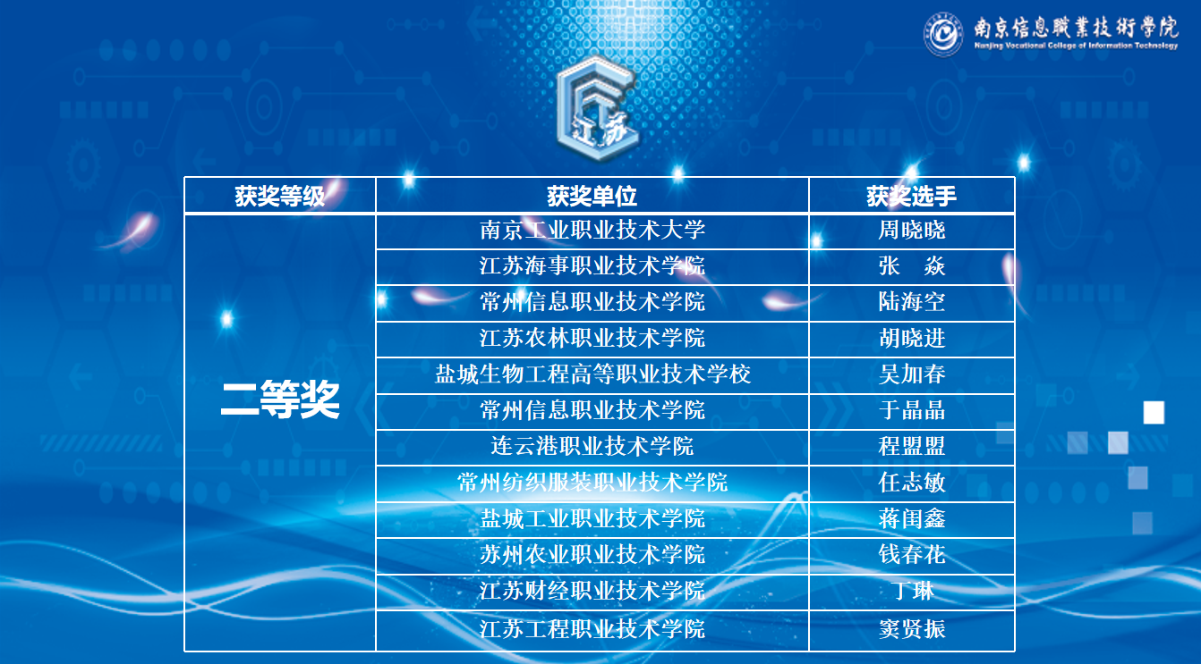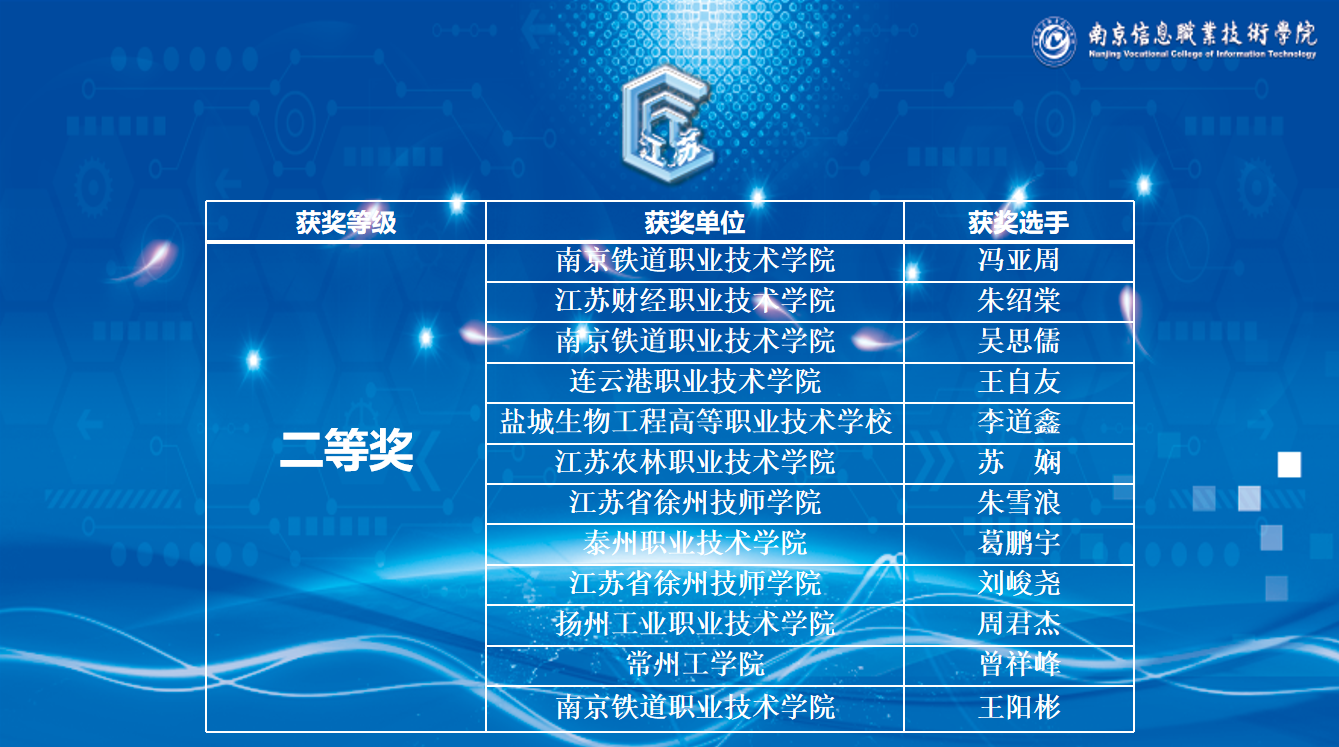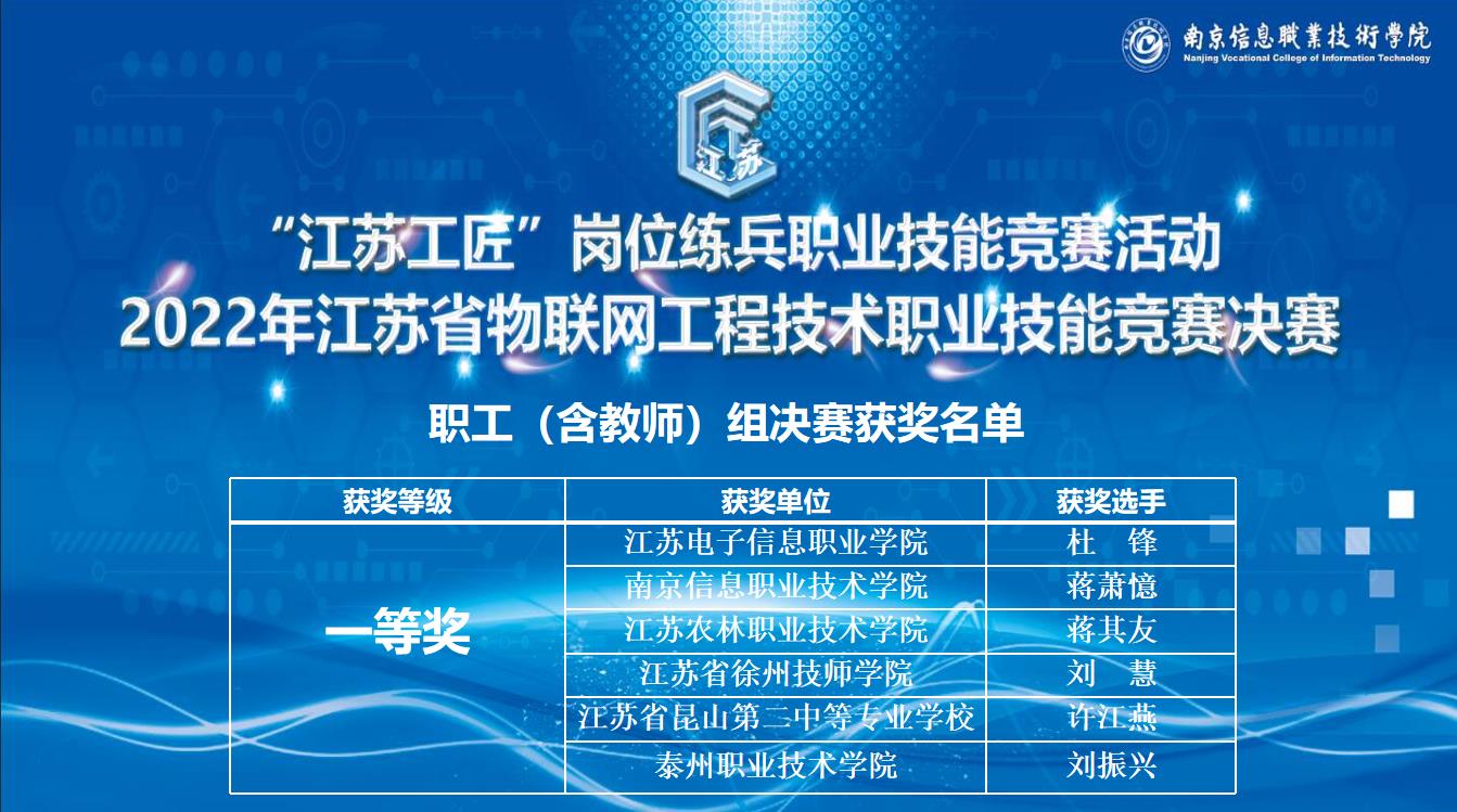 10月30日,在“江苏工匠”岗位练兵职业技能竞赛“物联网工程技术”赛项决赛中,我院信息工程色花堂 师生10人分别参加职工组和学生组决赛,共获8个奖项,其中蒋其友、胡晓进、崔明老师分获职工组一、二、三等奖,学生组苏娴等5名学生获二、三等奖。
