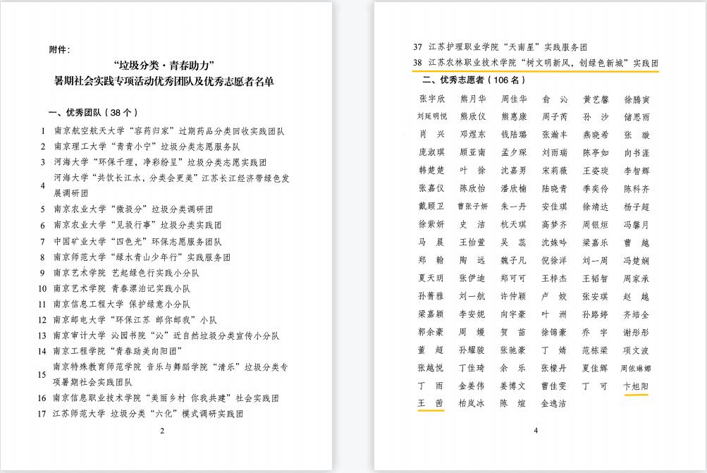 近日,由共青团江苏省委联合江苏省青年志愿者协会开展的江苏大学生暑期社会实践专项活动评审结果揭晓。我院“树文明新风 创绿色新城”暑期社会实践团获评“垃圾分类·青春助力”江苏大学生暑期社会实践专项活动优秀团队,王茜、卞旭阳2名同学获评优秀志愿者。