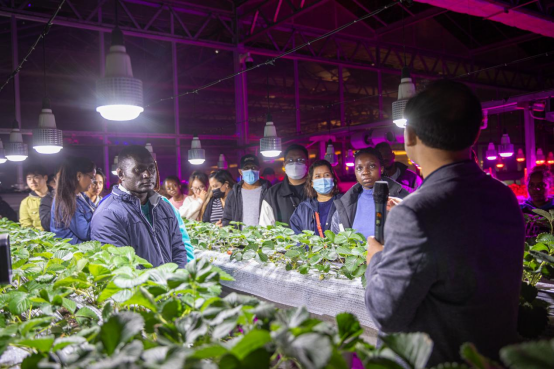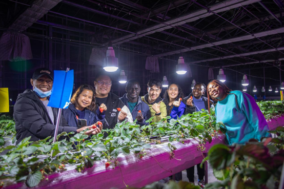王全智老师,现场讲解现代化草莓种植设施及栽培技术。在现场教学过程中,留学生积极与教师探讨,认真实践。