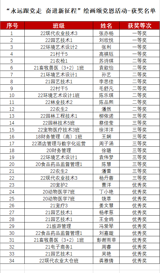 本次活动自启动以来,共收集学生作品86幅,教师作品4幅。经专家评审,22环境艺术设计2班张利、22现代农业技术3班张亦杨、22园艺技术1班刘欣悦、21定制村干5班高褀钰同学获得学生组一等奖;王蓓老师获得教师组第一名。