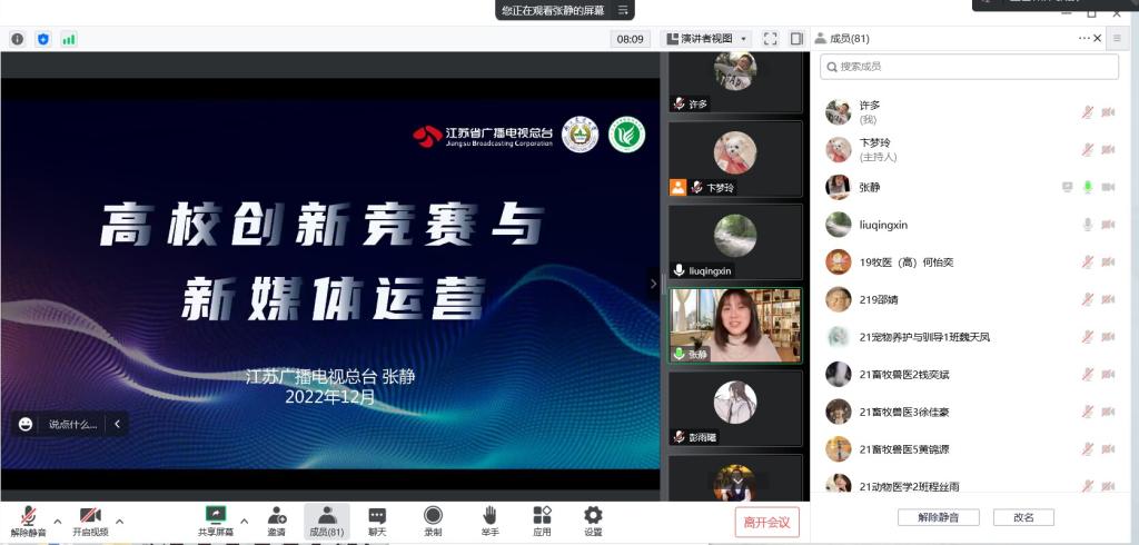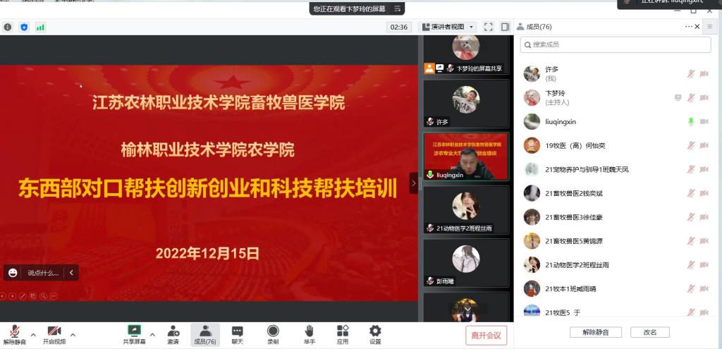 12月15日晚,畜牧兽医色花堂 联合榆林职业技术色花堂 开展线上东西部对口帮扶培训活动。活动邀请了第七届“互联网+”创新创业大赛银奖获得者张静对历届大赛进行解读,分别从选题、项目计划书、PPT等方面进行细致讲解。另外,畜牧兽医色花堂 与榆林职业技术色花堂 科技人员针对红枣羊的养殖技术进行了探讨和交流。