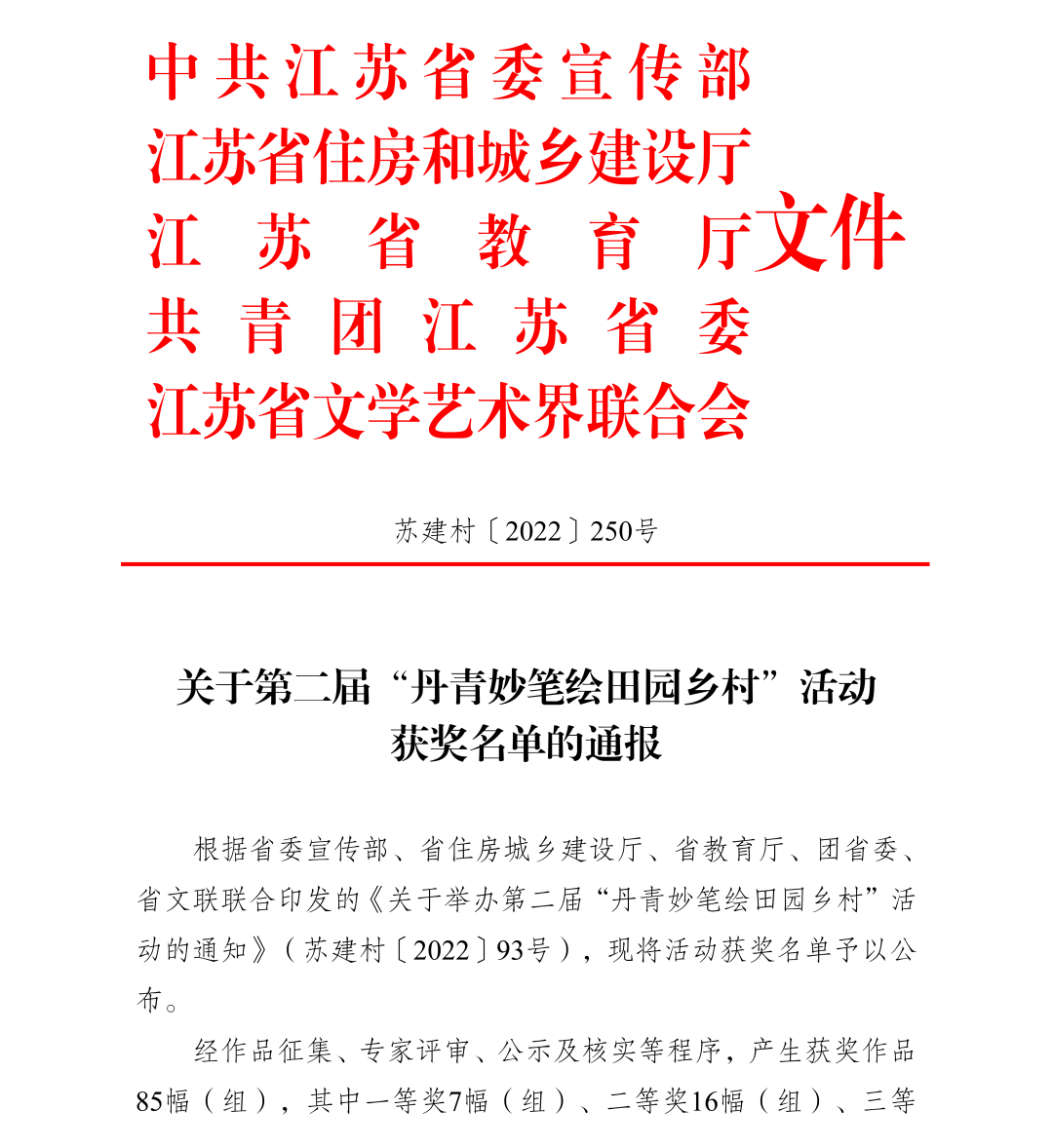 近日,省委宣传部、省住房城乡建设厅、省教育厅、团省委、省文联联合印发的《关于第二届“丹青妙笔绘田园乡村”活动获奖名单的通报》(苏建村〔2022〕250号),我院荣获优秀组织奖1项、优秀奖3项。