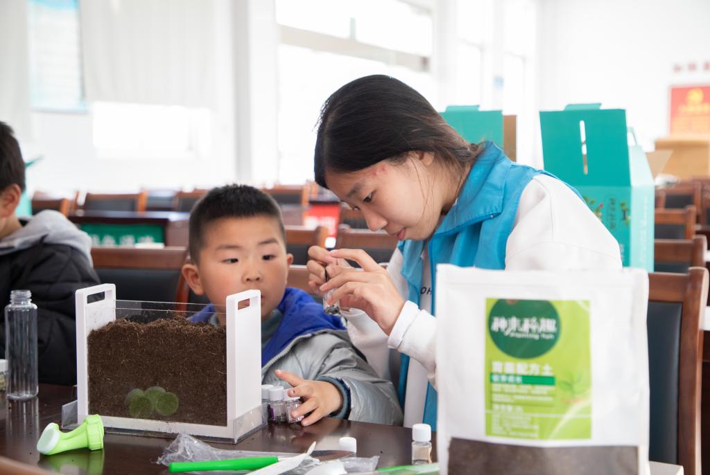 活动中,志愿者用简单易懂的语言向城盖村的小朋友们普及智慧农业知识,激发了小朋友们对智慧农业的思考。课堂上,小朋友们积极地举手发言,学习氛围活跃。随后,在志愿者的帮助下,小朋友们在植物观察盒里种下春天“第一粒”种子,他们在实践中感受农业种植的快乐。