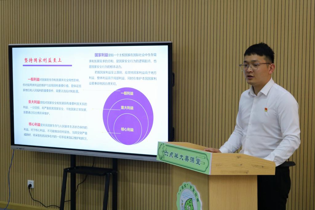 军事课教师周文炎围绕“国家安全与总体国家安全观”开展主题宣讲,他从全民国家安全教育日的由来、国家安全的基本概念、破坏国家安全的行为和提高安全意识、总体国家安全观四个方面进行了深入细致的讲解。