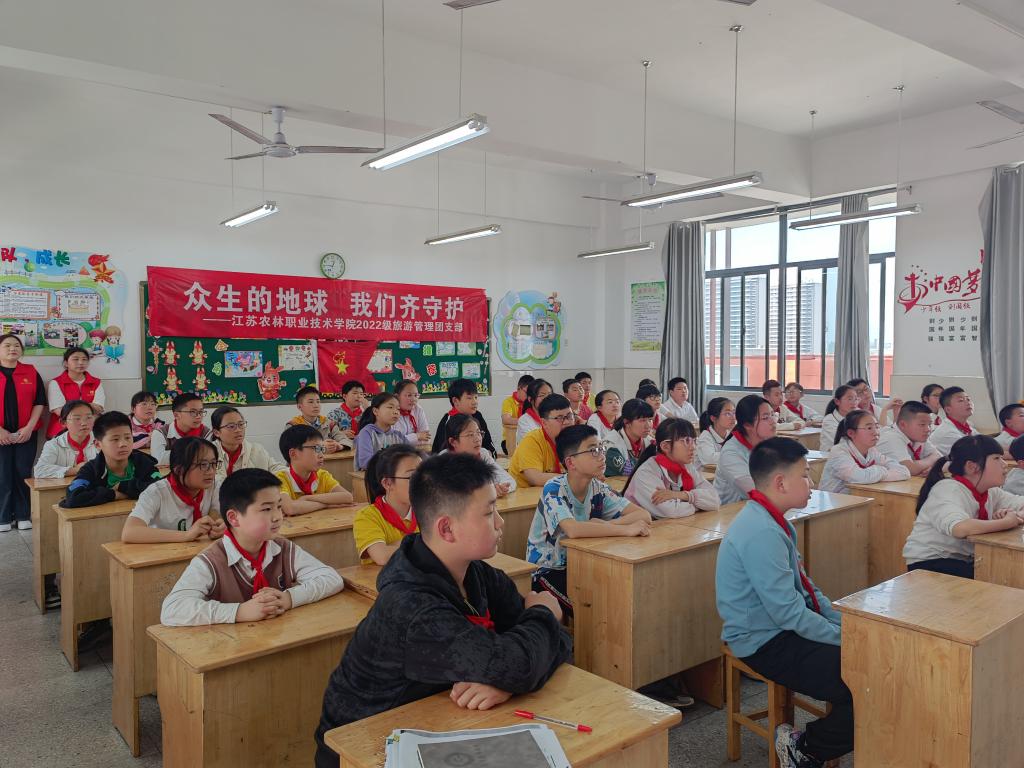 在全国第54个世界地球日(4月22日)来临之际,4月17日下午,经济与人文色花堂 22旅游管理团支部走进句容市崇明小学文昌校区六(5)中队开展“众生的地球我们齐守护”主题活动。