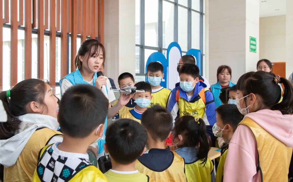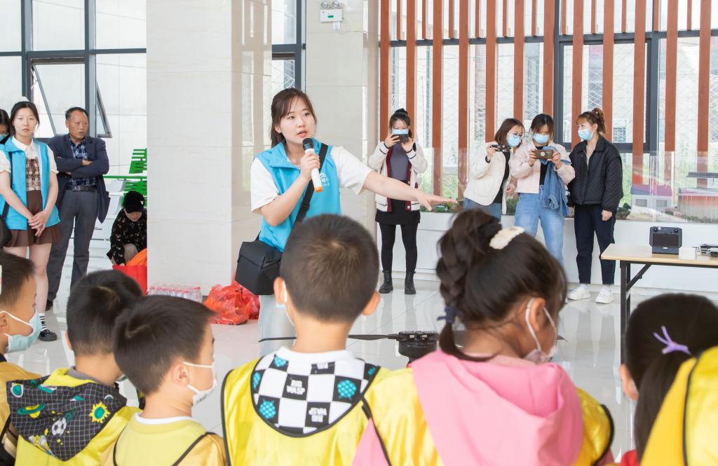 活动中,志愿者为小朋友们上了一堂生动的“农用无人机”小课堂,讲解农用无人机工作原理,与小朋友们互动问答,并在户外演示农用无人机的操作。