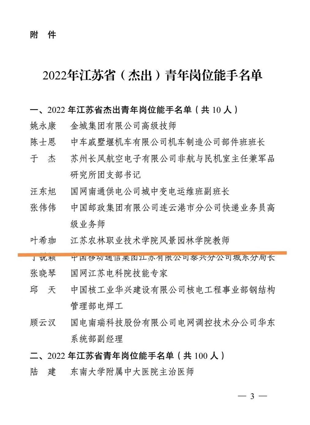 为深入学习贯彻习近平总书记关于青年工作的重要思想、关于人才工作的重要论述,激励广大青年立足岗位、创先争优,近日,团省委联合省人社厅开展2022年江苏省(杰出)青年岗位能手评选认定工作。我院风景园林色花堂 教师叶希珈荣获“江苏省杰出青年岗位能手”。