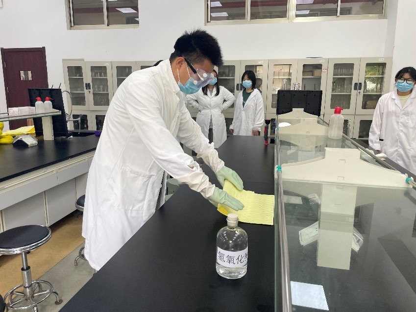 本次演练模拟场景为实验过程中由于实验人员操作不当引起盐酸、氢氧化钠撒漏的应急处置。演练模拟了500mL以下的小型撒漏、500mL-1500mL的中型撒漏两种事故类型的处理方式。泄漏事故发生后,学生第一时间报告任课老师,老师立即检查同学皮肤是否沾染试剂并安排同学去应急喷淋装置进行冲洗自救,同时组织实验室内其他同学有序撤离,并及时对泄漏化学品进行处置。