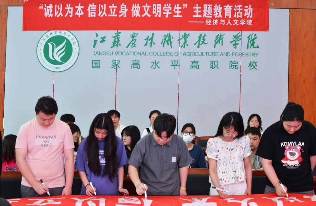 组织诚信宣誓。邀请办理生源地助学贷款学生代表、2023年度“江苏省优秀学生干部”20文秘梅克发同学进行领誓,现场同学们集体宣誓,并签订诚信还款承诺书,立下守信诺言。
