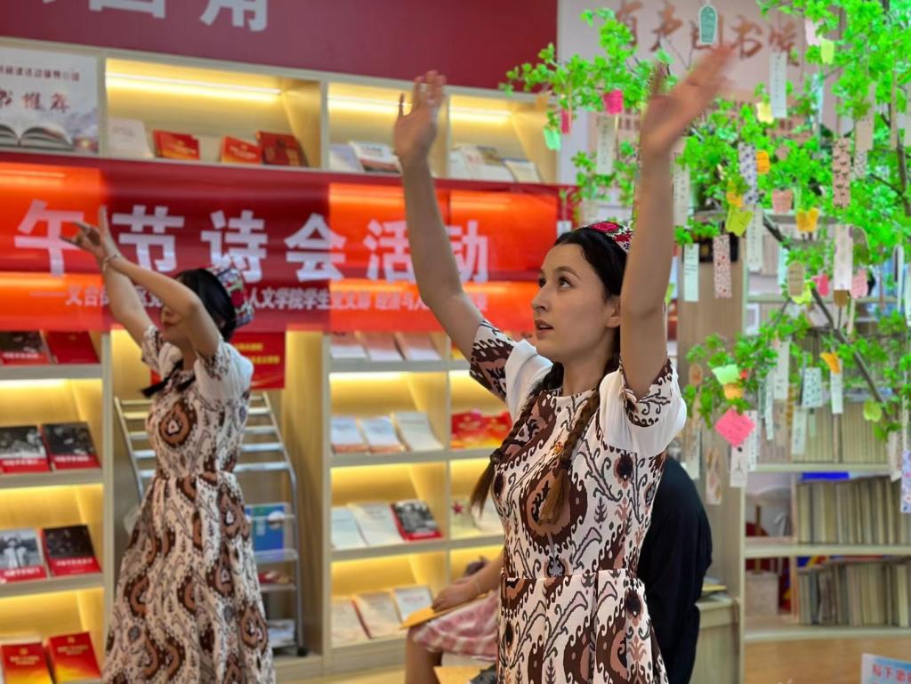 活动分为三个环节。“中华风雅·诗韵端午”环节以诗歌为舟,以纪念为桨,使在场的师生感受到了诗人屈原忠于国家、至死不渝的精神;“红色赋能·浓情端午”环节由“杨树电台”主播分享了党史故事《红色英雄秋瑾》,在家国情怀中感受中华革命文化,传承红色基因、汲取奋发力量;“民族融合·相约端午”环节,由维吾尔族同学阿依米尼沙和米合热班带来优美的新疆舞表演。义台街社区的三位老人讲解了端午节的来历、习俗和端午节佩戴香囊的由来、效用等知识,并教授大家制作香囊的方法。