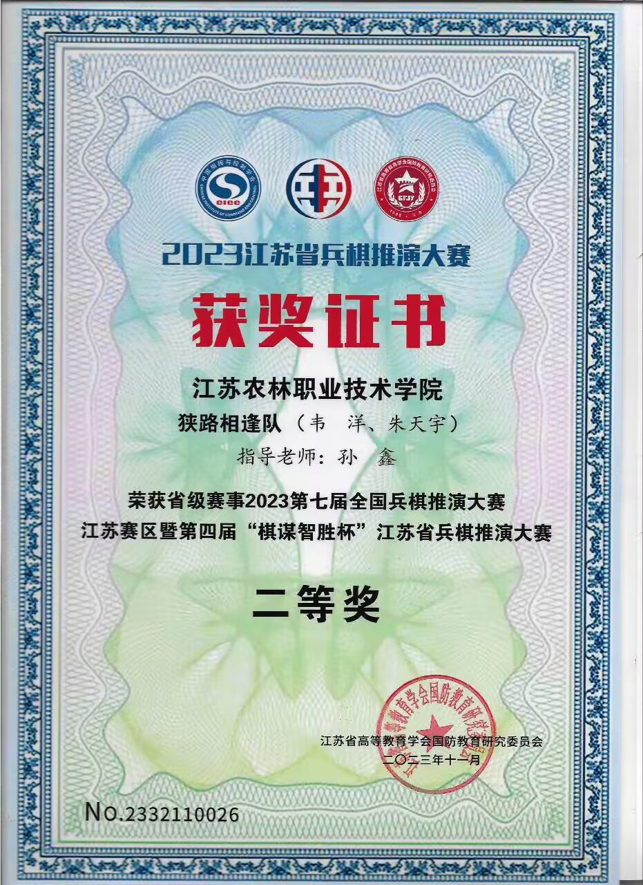 近日,由中国指挥与控制学会指导,江苏省高等教育学会国防教育研究委员会主办的2023年全省普通高校本专科学科竞赛省级赛事——2023第七届全国兵棋推演大赛江苏赛区暨第四届“棋谋智胜杯”江苏省兵棋推演大赛已落下帷幕。该项赛事历时两个月,吸引了省内40个单位568支队伍1136名选手们迈入“没有硝烟的战场”,展开激烈的角逐对抗。我院在此次比赛中获二等奖1项(获奖者:韦洋、朱天宇)。