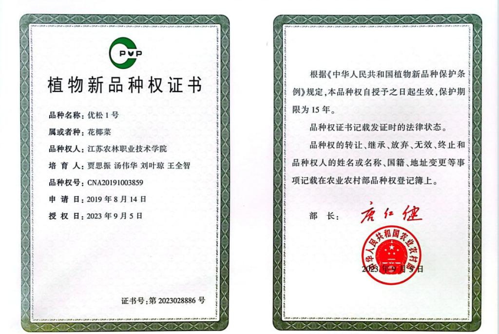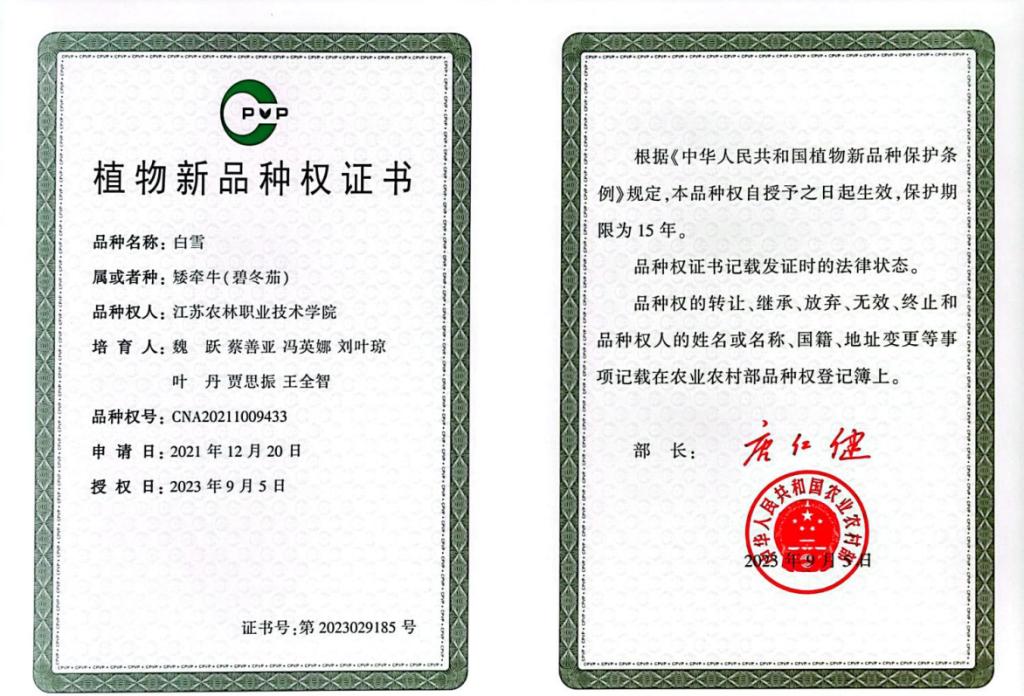 近日,我院魏跃团队选育的‘白雪’矮牵牛(碧冬茄)、贾思振团队选育的‘优松1号’花椰菜获得农业农村部植物新品种权。