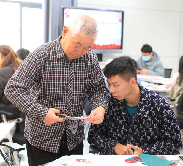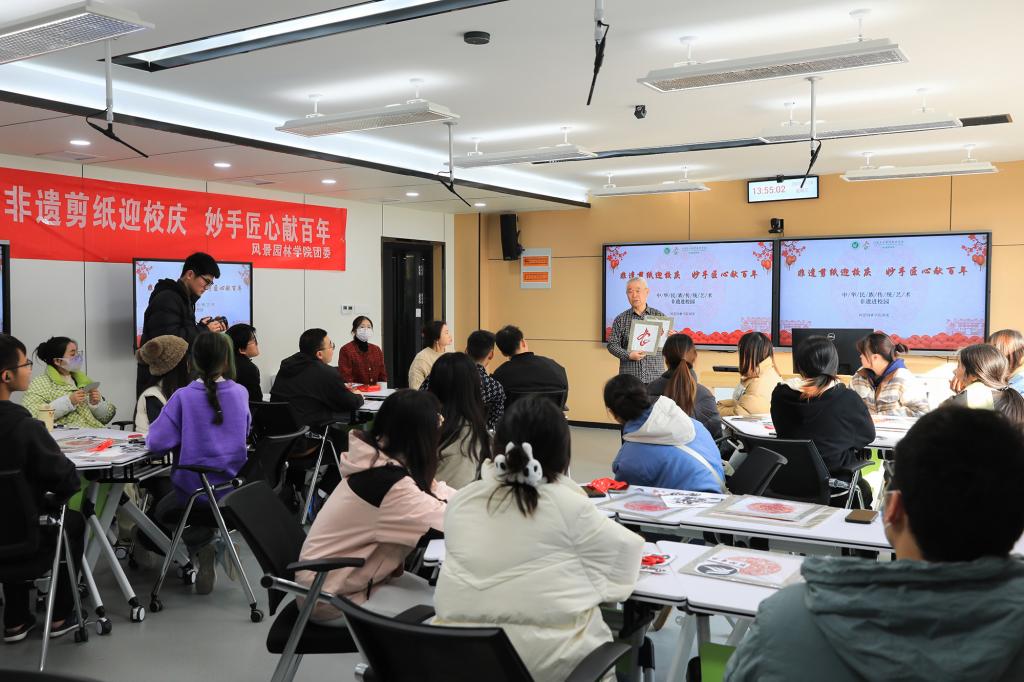 团委邀请国家级非物质文化遗产项目剪纸(南京剪纸)代表性传承人、江苏省工艺美术大师大师张方林同师生一道开展“非遗剪纸迎校庆,妙手匠心献百年”献礼百年校庆活动。