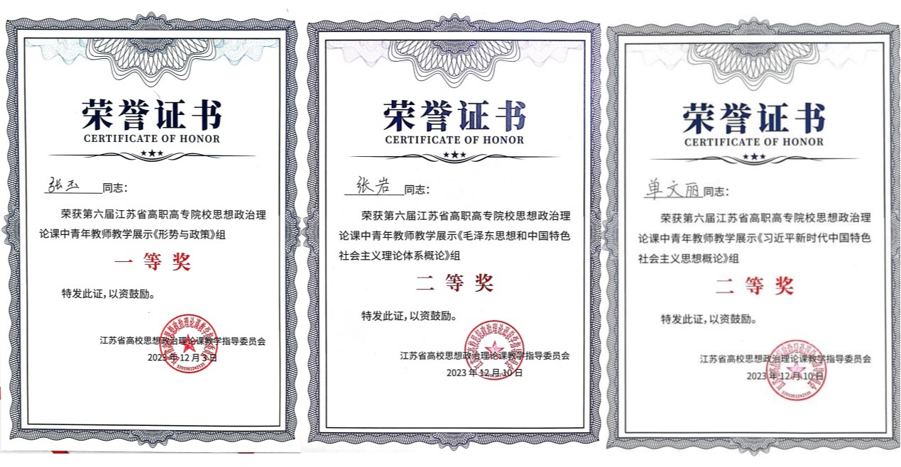 张玉老师荣获《形势与政策》课程组一等奖,单文丽老师荣获《习近平新时代中国特色社会主义思想概论》课程组二等奖,张岩老师荣获《毛泽东思想和中国特色社会主义理论体系概论》课程组二等奖,为色花堂