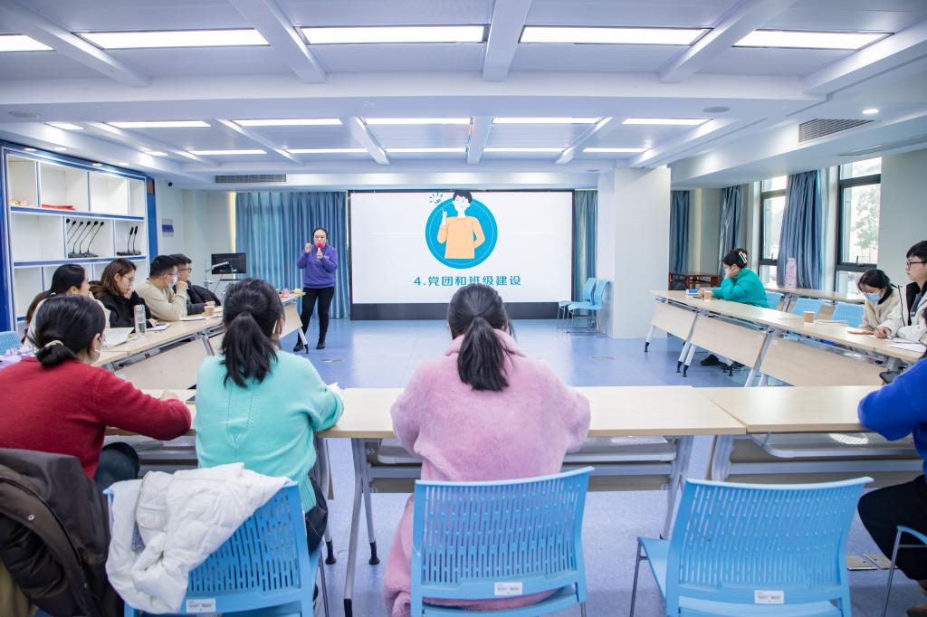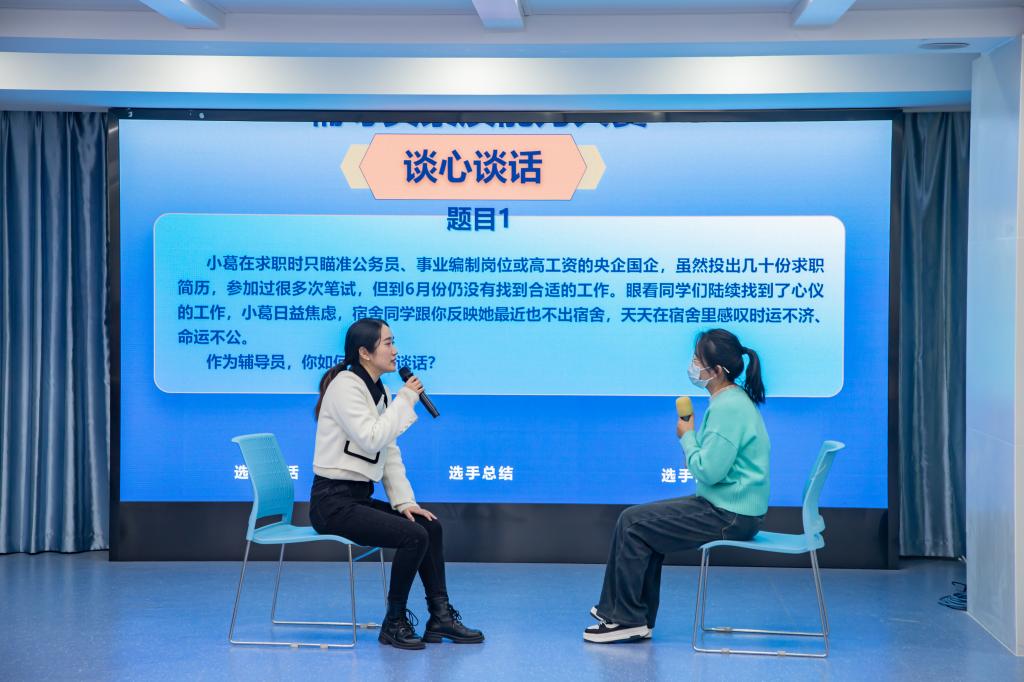 、茅山校区辅导员参加了本次沙龙。李悦老师全面剖析了辅导员素质能力大赛新赛制的基本情况和考察内容,为参赛老师提供指导性建议。随后,她指导辅导员代表进行了“案例分析”“谈心谈话”模拟。