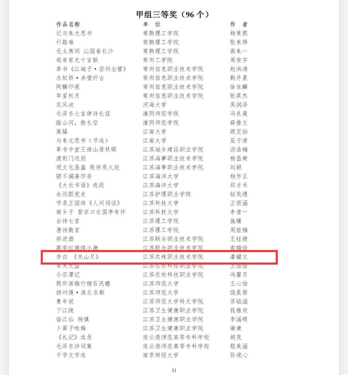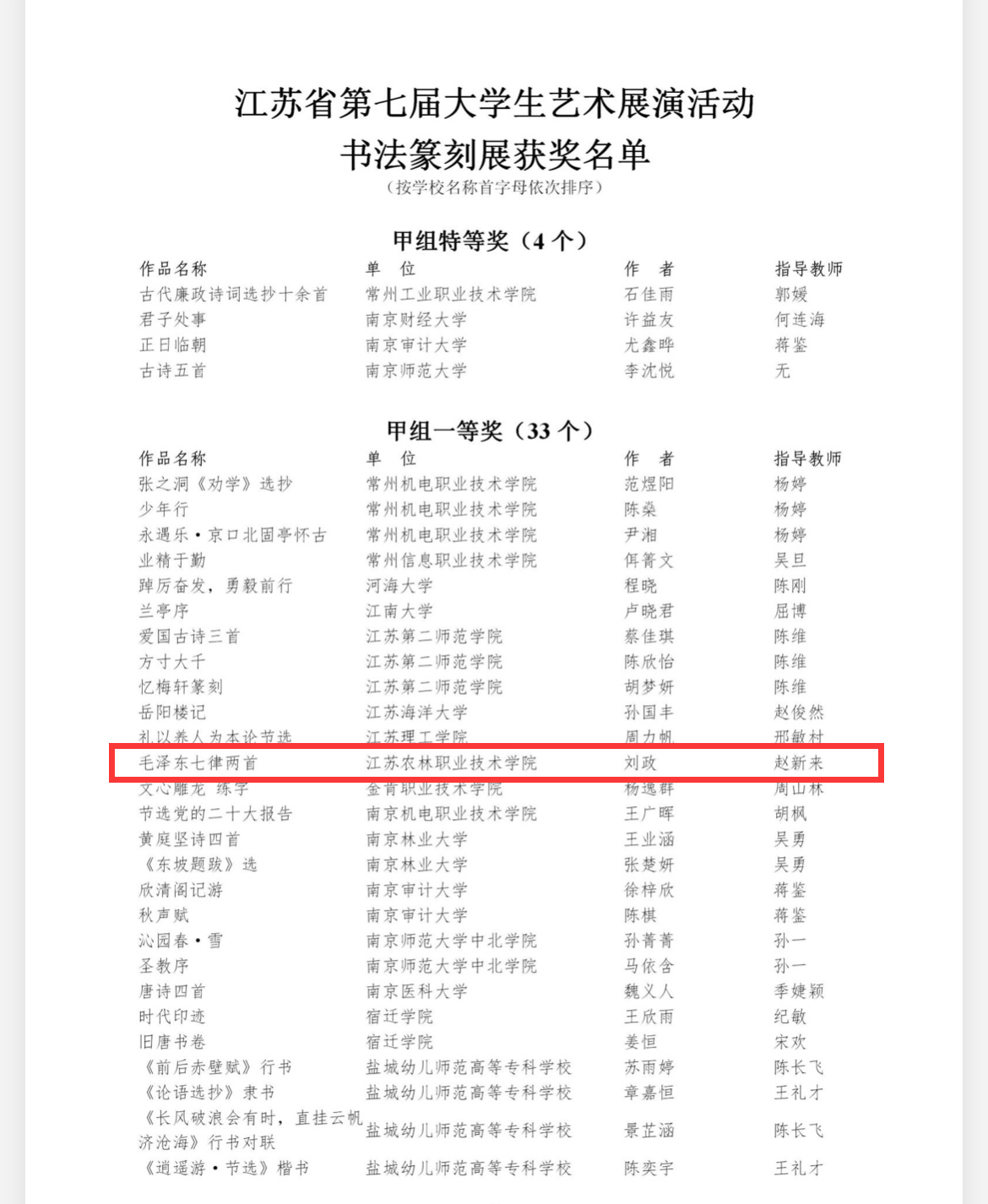 近日,由江苏省教育厅主办的江苏省第七届大学生艺术展演活动落下帷幕。“翰墨色花堂”书画社刘政同学的作品《毛泽东七律两首》荣获书法篆刻展甲组一等奖,潘耀文同学的作品《关山月》荣获甲组三等奖,作品均由茅山校区赵新来老师指导。参赛作品紧紧围绕“厚植家国情怀,涵养进取品格”主题,结合时代特征,展现了大学生心怀国家、朝气蓬勃、昂扬进取的精神风貌和茅山校区润物细无声的美育成效。
