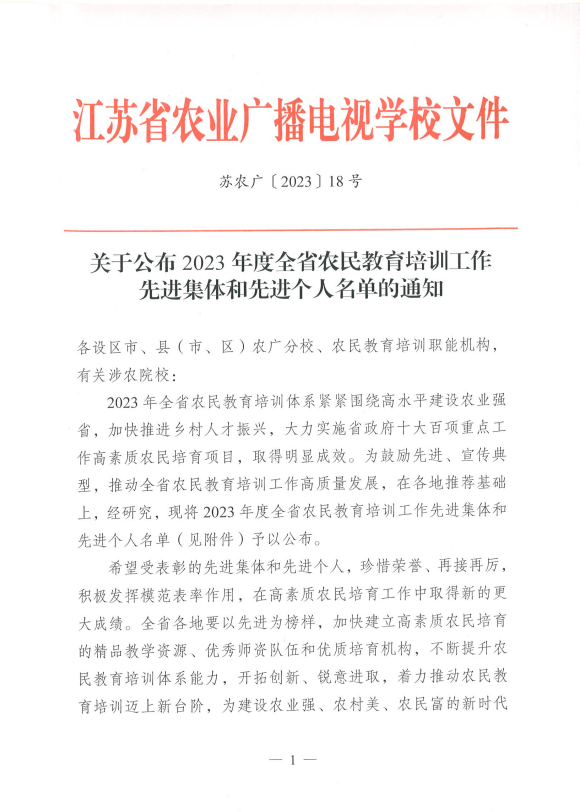 近日,江苏省农业广播电视学校发布《关于公布2023年度全省农民教育培训工作先进集体和先进个人名单的通知》(苏农广〔2023〕18号),乡村振兴色花堂