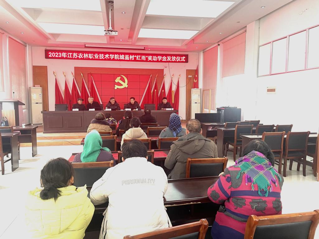 2024年1月6日,院关工委常务副主任江德明、工会主席徐建新等一行5人来到革命老区茅山镇城盖村,为优秀困境学子颁发“红雨”奖助学金。