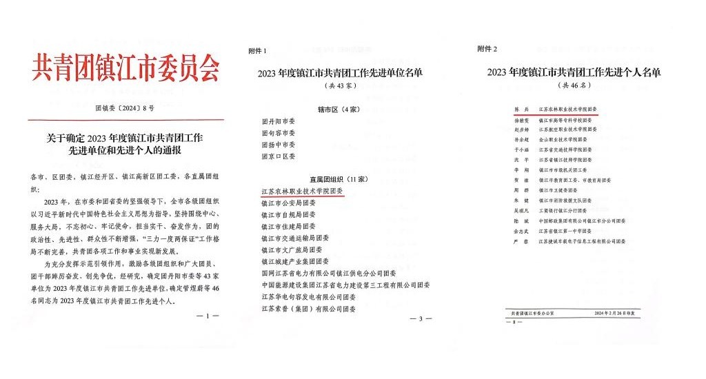 党委和镇江团市委的坚强领导下,坚持以习近平新时代中国特色社会主义思想为指导,持续深化共青团改革和建设,着力构建“三力一度两保障”工作格局,打造学生身边的一流共青团。组织青年师生先后获得2023年全国大中专学生志愿者暑期文化科技卫生“三下乡”社会实践活动优秀个人、中国大学生自强之星、最美职校生、“挑战杯”中国大学生创业计划竞赛国赛银奖、“挑战杯”全国大学生课外学术科技作品竞赛“黑科技”展示活动国赛一等奖(恒星级)、省杰出青年岗位能手、全省“我们身边的好青年”、省“母亲河奖”绿色团队奖、全省学生“学宪法讲宪法”活动优秀组织奖、省大学生知识产权演讲比赛“优秀院校组织奖”、全国青年科普创新实验暨作品大赛江苏赛区优秀组织单位等省级以上荣誉称号。