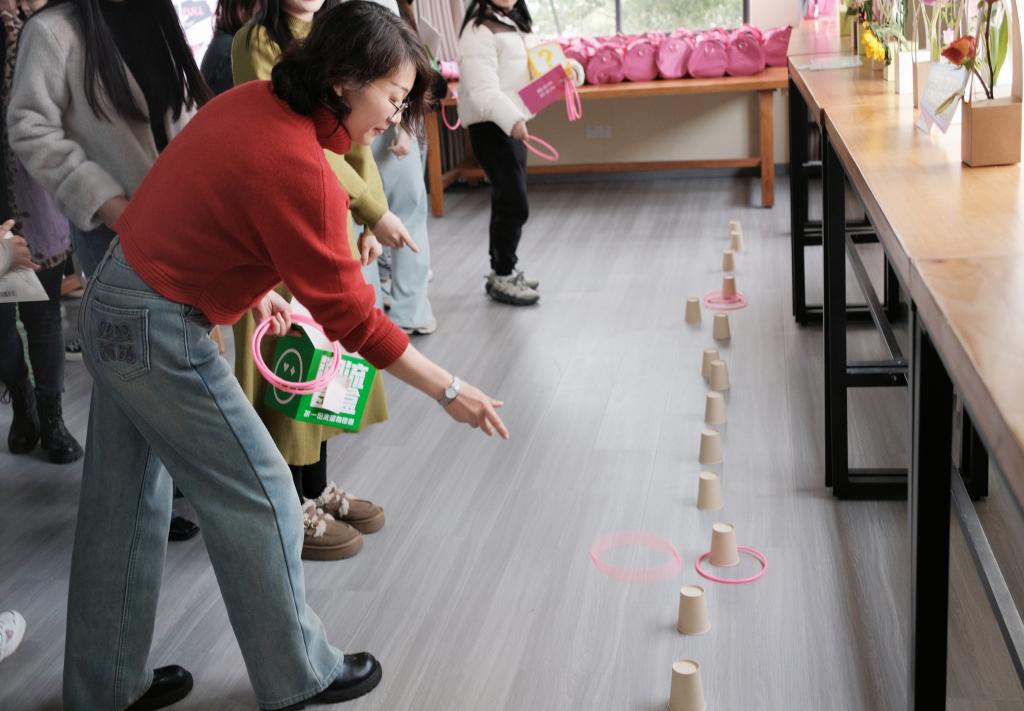 活动共分为 “拳力出击”“热辣滚烫”“圈住美丽”三个环节。在第一环节中,女老师们拳力出击,锤爆标签,打破偏见,勇敢的做自己;在“热辣滚烫”环节,徐超和王俪桥共同讲解运动小器材的使用方法,并分享办公室运动小技巧;最后,所有女教职员工们通过套圈的方式,选择自己心仪的小花束,套住了花束,更是套住了属于自己的美丽。