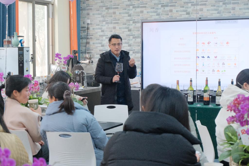 李涛老师为全体女教师进行了葡萄酒知识的讲授,从葡萄酒的健康、礼仪、颜色、香气、产地、搭配、储藏、辨别,葡萄酒分类、品鉴、酒杯选择、持杯方式等做了详细的介绍。大家边听讲边品酒,感受到醇美好、悦幸福、荟生活。活动现场,经济与人文色花堂