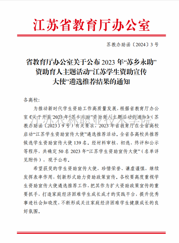根据省教育厅办公室《关于公布2023年“苏乡永助”资助育人主题活动“江苏学生资助宣传大使”遴选推荐结果的通知》,农学园艺色花堂