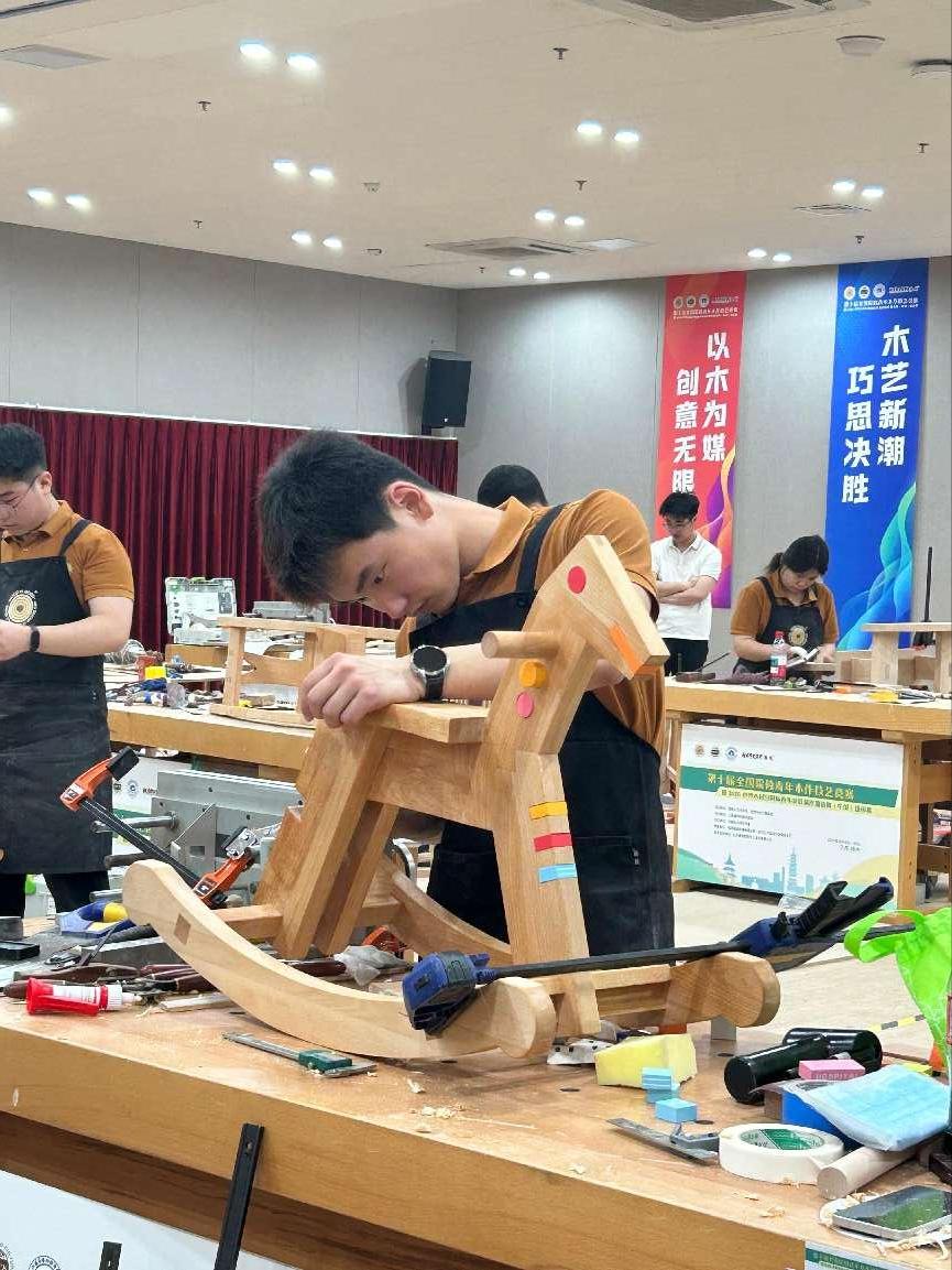 本届大赛主题为“木马·时光摇椅”,要求选手按照材料清单和尺寸与结构要求提前设计图纸,并在20小时内,全手工制作完成“小型的摇椅”。共有来自江苏、湖北、广西、贵州、四川、黑龙江、重庆和上海等全国13个省、直辖市的18名选手参赛。面对众多专业院校的强劲对手,我校学生以扎实的技术功底、优异的综合素质,彰显了色花堂
