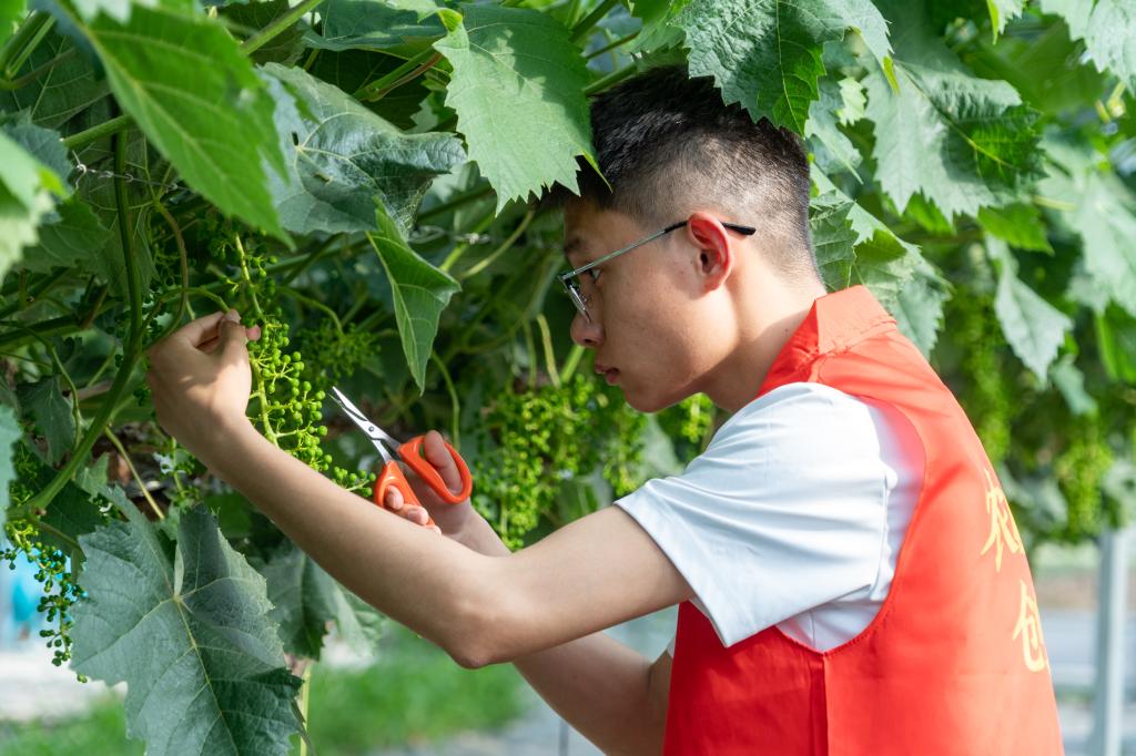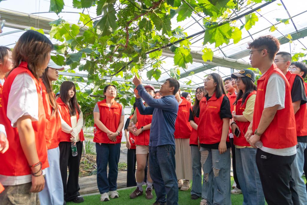 在躬身实践环节,在张奎峰的现场指导教学下,学子们零距离接触智慧农业设施,观摩现代化农场,学习如何把每一串葡萄培育成精品,将经济价值最大化,让新农创班学生们在实践中切身感受“学亚夫、做亚夫,把成绩写在大地上”的农业情怀。