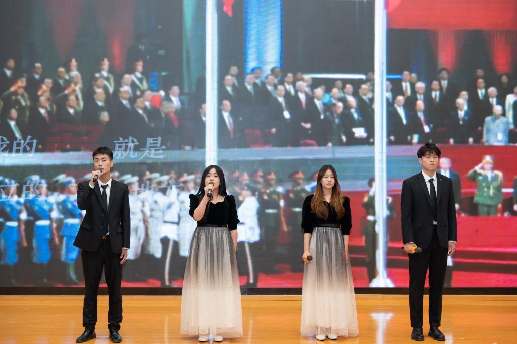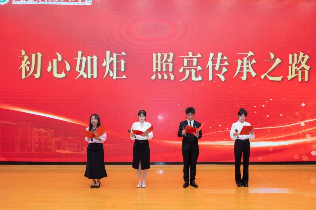 教师代表通过镜头向青年学子传递殷切期望。毕德全在致辞中勉励青年:一要向阳而生,传承红色基因,争做优秀的党的助手和后备军;二要向善而行,严以修身,向着至善至美而为;三要向上登攀,提升强农兴农本领,向着服务乡村振兴攀登。随后,刘梅带来微团课《追光》,以鲜活案例诠释青春奋斗的真谛,魏爽杨子带着新老团员朗诵《传承》,引发全场共鸣。
