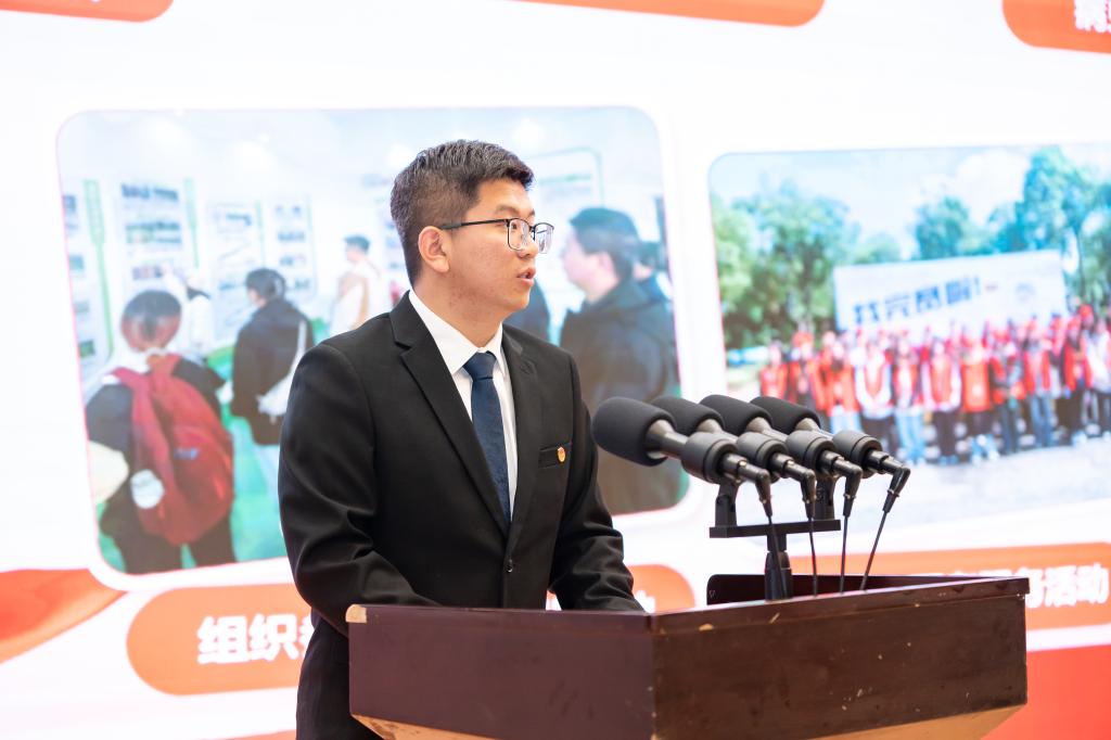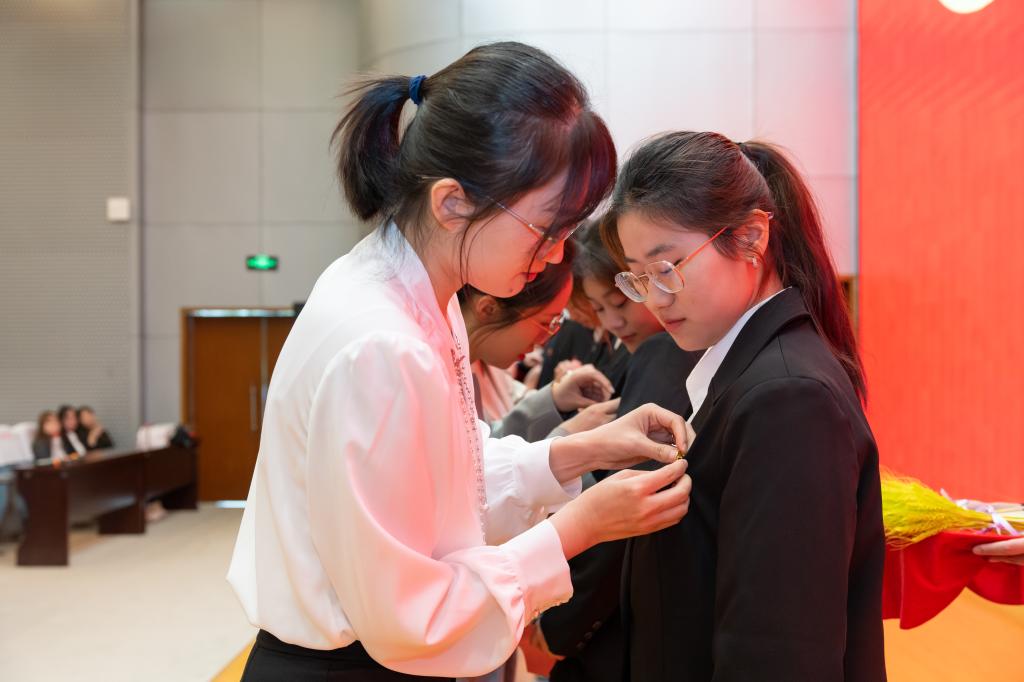团委书记为新团员代表佩戴团徽。这一刻,青春与信仰交织。李政兴同学以“以青春实践之笔 绘乡村振兴新篇”为题,分享扎根田野的实践故事;王福乐同学在《知行无涯》中讲述求知路上的成长感悟,展现了色花堂学子知行合一的担当。