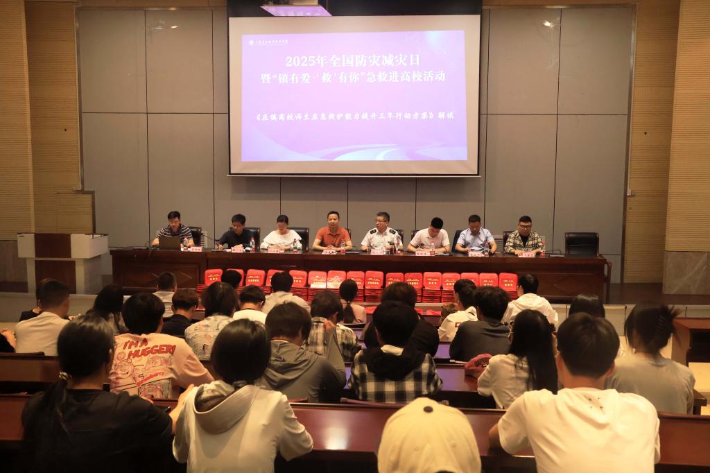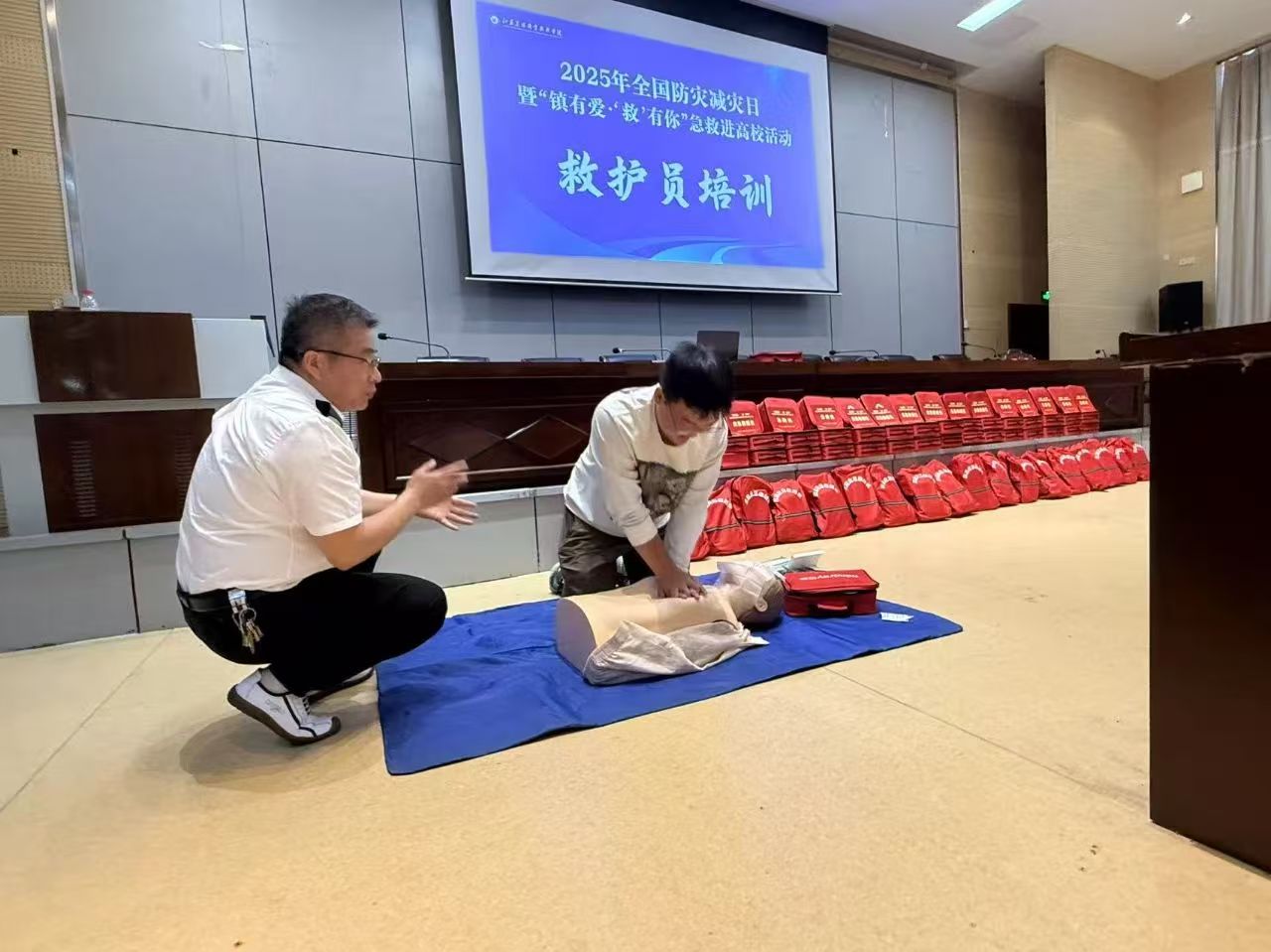 与句容市急救站携手举办了2025年全国防灾减灾日暨“镇有爱・‘救’有你 ”急救进高校活动,后勤基建处、学生工作处、团委、体育部、茅山校区管委会和句容市急救站相关负责同志和100余名师生代表参加此次活动。