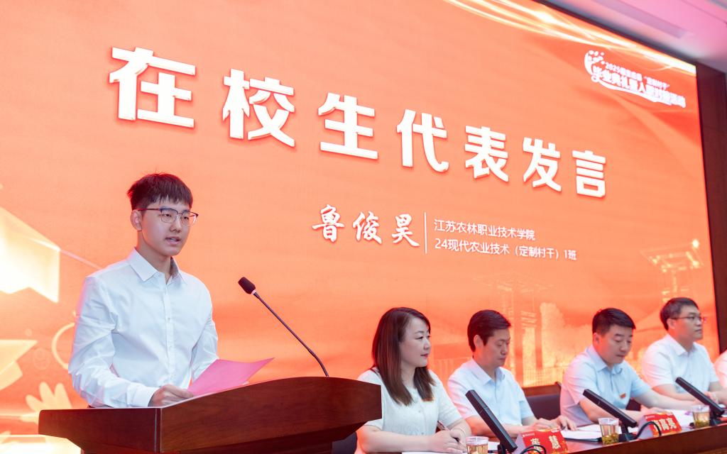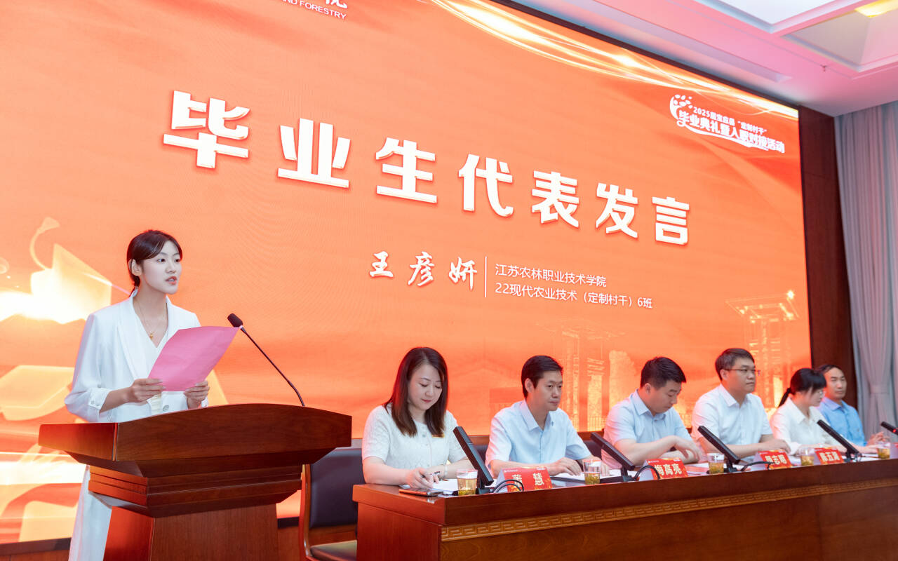活动现场,颜志明为2025届宝应县“定制村干”颁发毕业证书;董慧与梅高亮共同完成《2025届毕业生双向选择就业推荐表》校地交接仪式;陈五湖向毕业生代表赠送“入职大礼包”,内含《习近平关于“三农”工作论述摘编》、乡村振兴研学手册、健康体检卡及电商培训入学通知书等,既体现组织关怀,更彰显对青年村干政治素养、实践能力、身心健康的全方位关注。梅高亮系统介绍了宝应县农业农村发展现状与人才需求,描绘了乡村振兴的广阔舞台。毕业生代表、22级现代农业技术(定制村干)6班王彦妍在发言中回顾了三年来的成长历程,表达了对母校培育和宝应县信任的感恩之情,承诺将以“懂农业、爱农村、爱农民”的情怀投身基层实践。24级在校生代表鲁俊昊郑重承诺,将以学长学姐为榜样,勤学苦练强本领,厚植“三农”情怀,为乡村振兴储备青春能量。