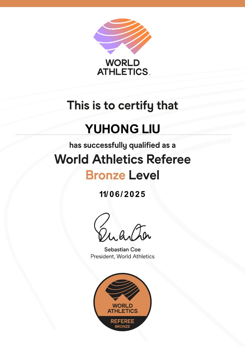 世界田径联合会的裁判资格认证体系严格,分为金、银、铜三个等级。报考者首先要有相应年限的国家级裁判员经验,同时对考试期间执裁过的比赛规格和次数也有要求。刘玉红于2015年获得国家级裁判资格后,十年期间,曾参加过世界田联室内锦标赛、亚洲老将田径锦标赛、全国田径大奖赛、全国田径锦标赛、全国田径U系列、全国残疾人田径锦标赛等大型体育赛事的执裁工作,并多次被评为“优秀裁判员”。