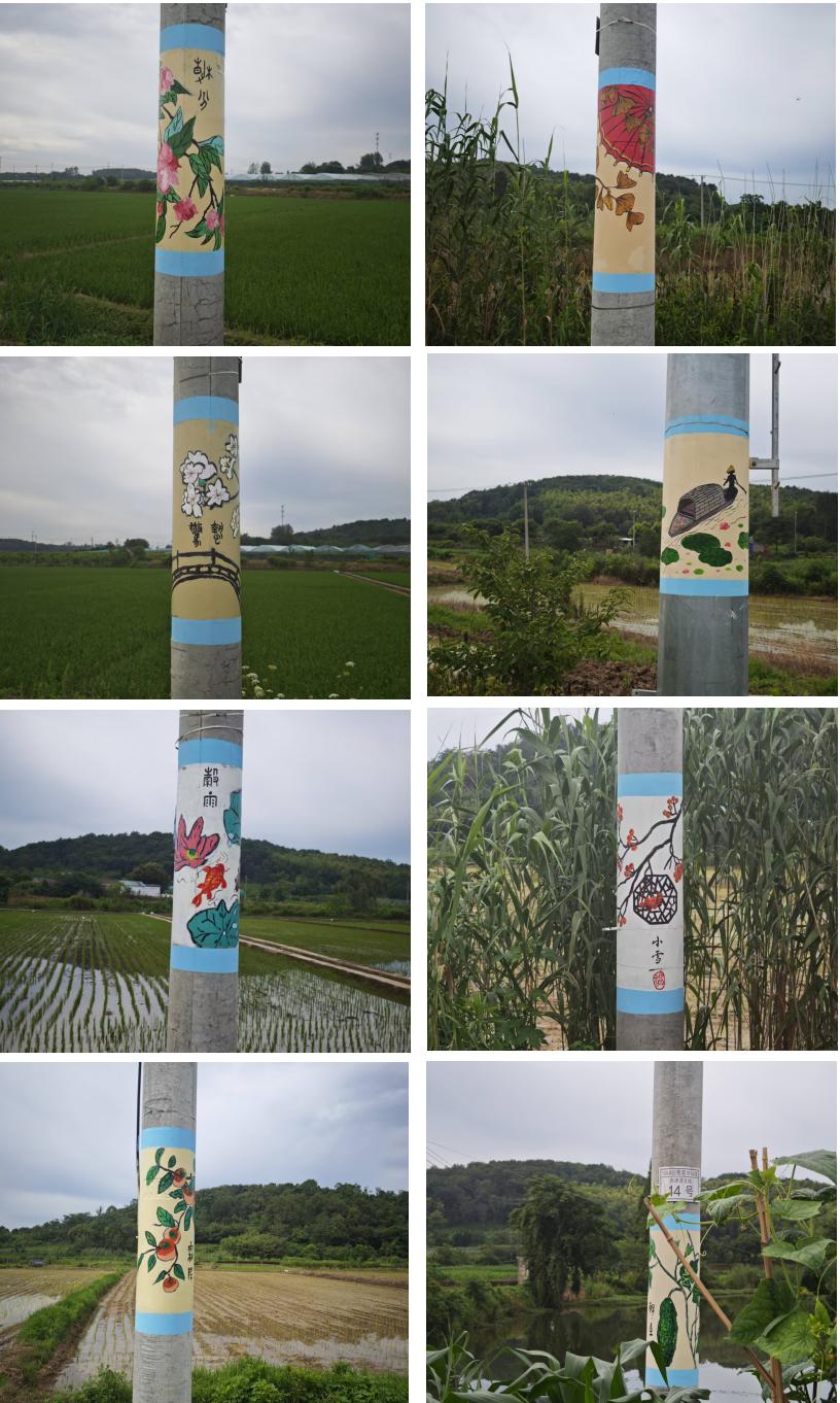 经过三天的不懈努力,“寻乡绘意”实践团最终圆满完成了 在24根电线杆上绘制二十四节气主题墙绘的创作任务。这条2.5公里长的乡村道路单侧,如今形成了一条独特的“二十四节气文化长廊”。微风轻拂,电杆上一幅幅描绘着不同节气特色的图画,与道路旁新插的翠绿秧苗、古朴的村舍相映成趣。原本单调的电线杆披上了绚烂的文化“新衣”,瞬间点亮了乡村环境,成为村民交口称赞的“新景观”。