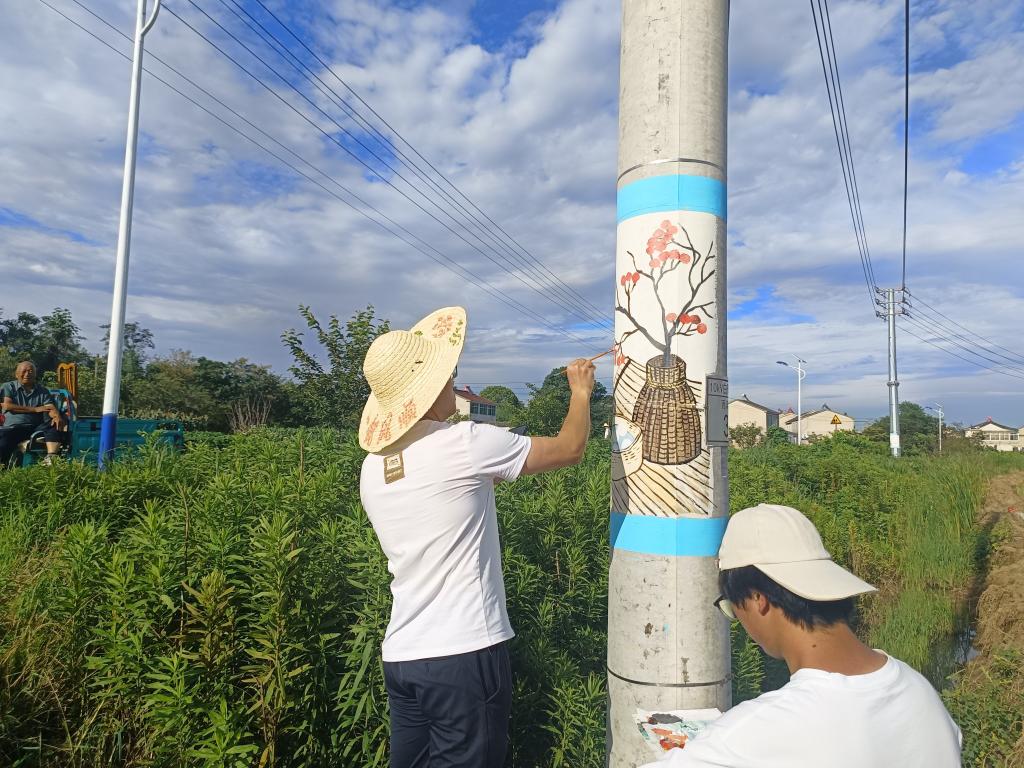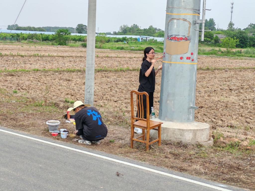 六月底的句容,骄阳似火,热浪袭人。实践团面临的首要挑战便是极端高温。师生们需长时间在毫无遮蔽的乡间道路上仰头作画。电线杆表面在烈日炙烤下温度极高,作业环境异常艰苦。汗水浸透衣衫,在队员们的T恤上凝结成盐霜;颜料在高温下干得极快,需要反复涂抹;手指缝里也常嵌满难以洗去的色彩。然而,这支团队展现了顽强的意志力,坚守岗位,一笔一画认真描绘。作画高度主要在离地面约1米至2米的范围,大部分情况下队员们借助凳子即可完成。对于少数地面不平或有沟坎的电线杆,村委会及时提供了有力支持,搬来木板搭建了稳固安全的作画平台。