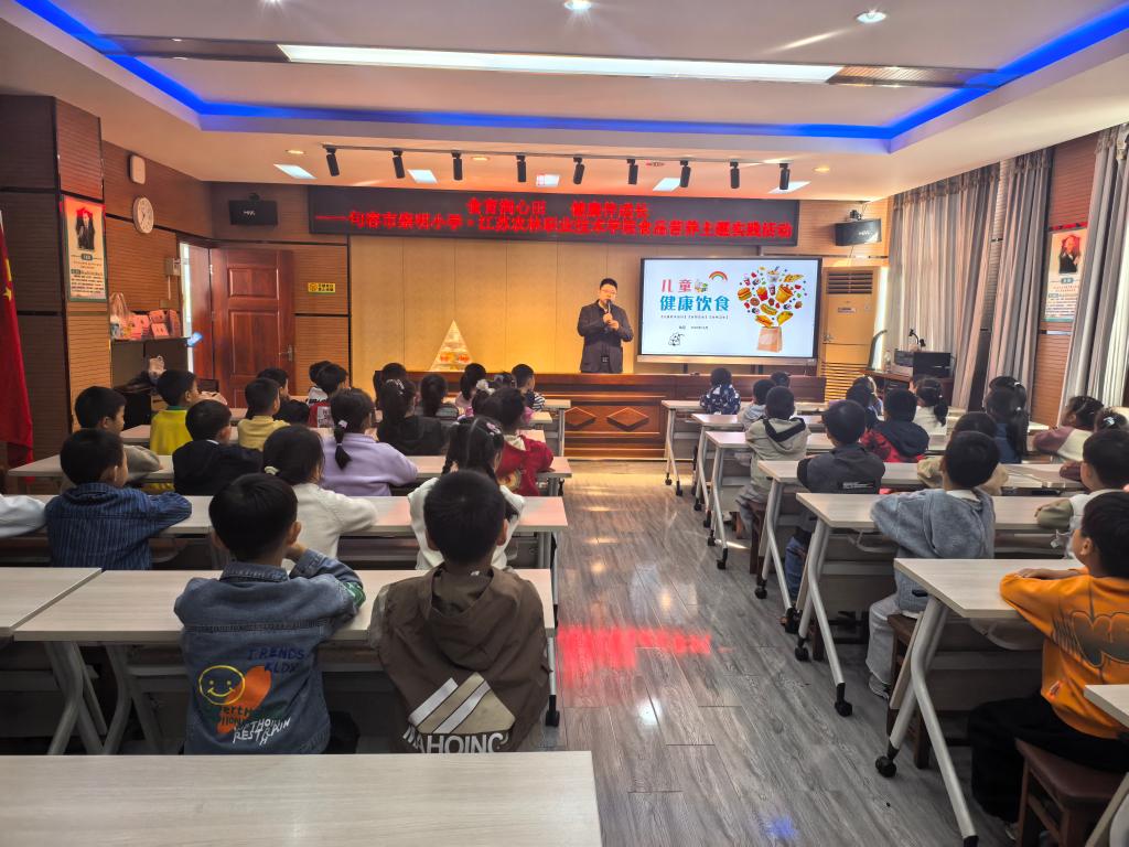 活动中,茶与食品系党支部书记陶程以“儿童健康饮食”为题开展科普讲座,结合小学生认知特点,用通俗案例讲解常见食物营养成分与不良饮食习惯危害,传递科学饮食观念,彰显“食匠先锋”专业服务社会的理念。志愿者们围绕中国居民膳食宝塔,通过趣味视频直观呈现膳食搭配原则,同步设计“食物分类小能手”等互动游戏,学生用食物模型分类、搭配营养午餐,让孩子们在玩中学懂健康饮食知识。