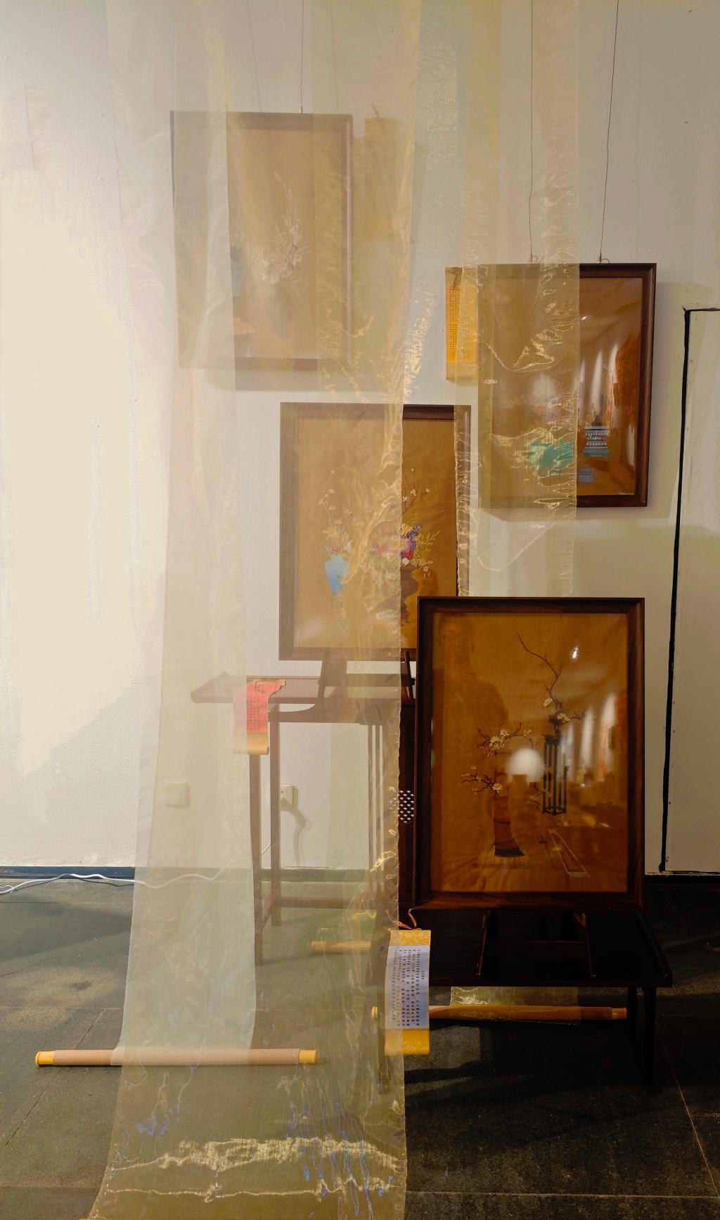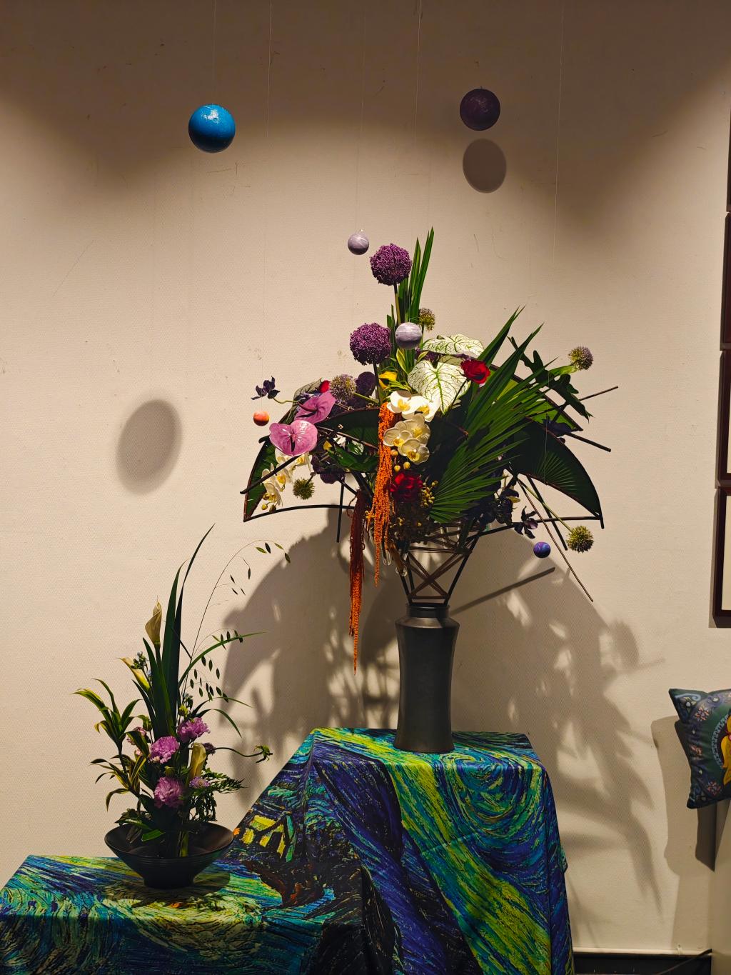 此次入展的作品,是我院深化美育教育、推动艺术与专业融合的典型成果。《木韵万象》以天然带皮木料手工拼贴,利用木材原生纹理呈现多重主题画面;《童年》通过一套大小木马,以实木材质诠释陪伴与成长的温暖主题;《梦想星轨》借花艺技法融合宇宙意象与东方美学,塑造星体运行的原创设计;《四镜流芳》以植物为墨、押花为笔,融合传统文化与现代美学;《山际幻彩》以马赛克玻璃碎片与填缝剂勾勒出山间色彩的层次与质感;《校园四季》用宠物美容收集的犬毛经植物染色制成展现校园美景的毛毡艺术画。