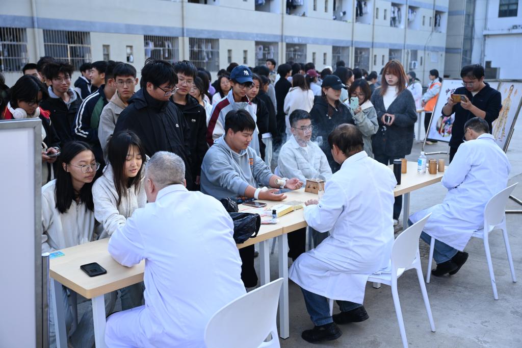 中医文化普及区搭建起传统医学与青年学子的沟通桥梁,让古老中医智慧与现代校园生活深度融合。3名经验丰富的中医师坐诊提供免费基础问诊,通过把脉辨体质,结合日常作息给出针对性调理建议;借助放大版穴位图、针灸模型直观讲解针灸原理,同步开展艾灸、针灸和拔罐体验,让学生在温热舒适的体感中感受中医理疗的独特功效和“辨证施治”的独特魅力。