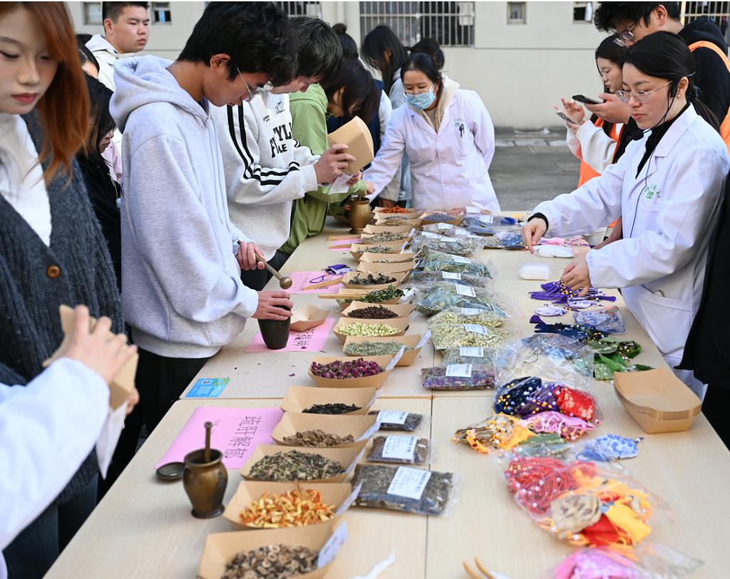 中药香囊制作区作为活动核心体验场域,本草芬芳与匠心巧思交织成趣。医师详细介绍薄荷清凉提神、藿香驱蚊避秽、艾叶祛湿散寒等20余种常用中药的功效,现场展示标注清晰的中药样本,学生们俯身闻香辨味,在感官体验中加深对本草特性的认知。领取材料包后,大家结合自身需求搭配中药用量,小心翼翼地将药材装入布袋、系紧棉线,在标签上认真书写中药搭配及功效。一个个承载着健康祈愿的香囊应运而生,既锻炼了动手能力,更让大家在沉浸式体验中加深了对中药文化的理解,以手作之力传递本草温情,以文化传承厚植健康理念。