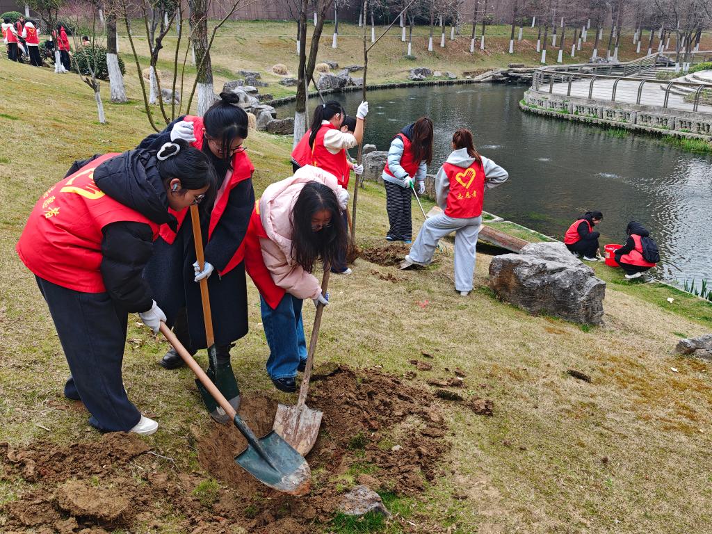 3月12日,由校区20名园艺技术专业学生组成的志愿服务团,前往句容寨里社区开展“护一抹青绿,暖一座城市”守护绿植公益行动,凭借专业知识助力社区生态建设。同学们运用所学专业知识,仔细勘察土壤条件,精准把控栽植深度,改良贫瘠土壤。他们规范地完成挖坑、扶苗、培土、浇水等工序,有效提升了树苗的栽植成活率。同学们专业的操作和认真的态度,赢得了社区居民的认可。