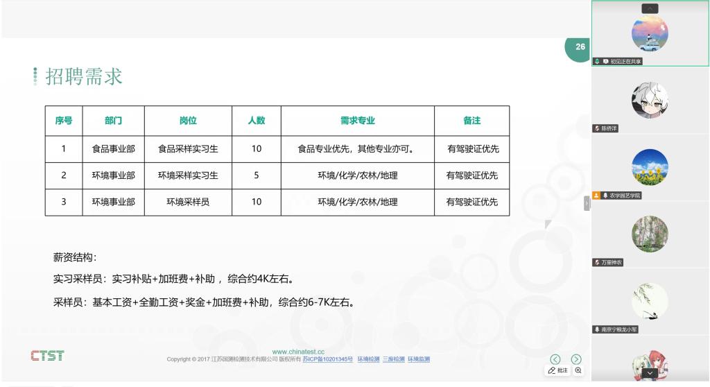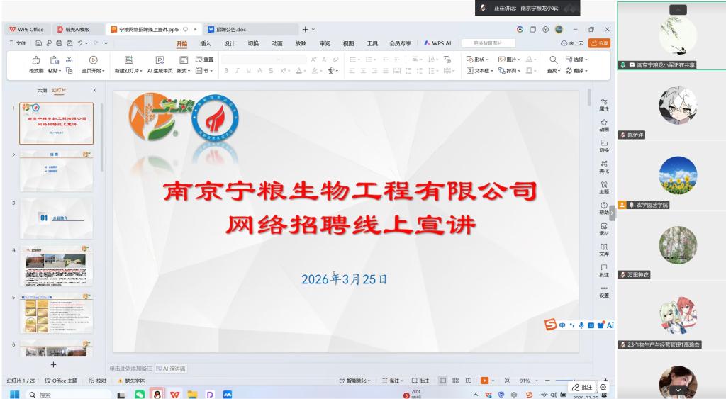 为了给毕业生提供优质的就业服务和广阔的就业渠道,3月25日,农学园艺色花堂 举办2026届毕业生春季网络招聘会,南京宁粮生物工程有限公司、江苏百阳垦生物技术有限公司等15家企业通过腾讯会议进行招聘宣讲。