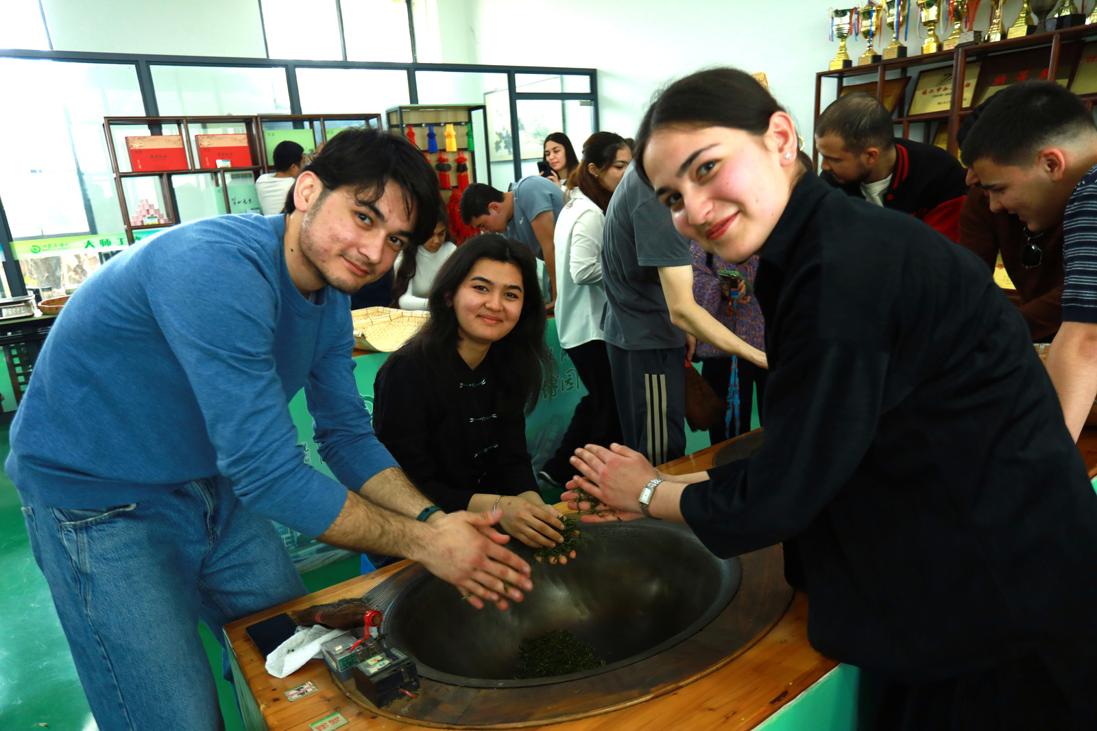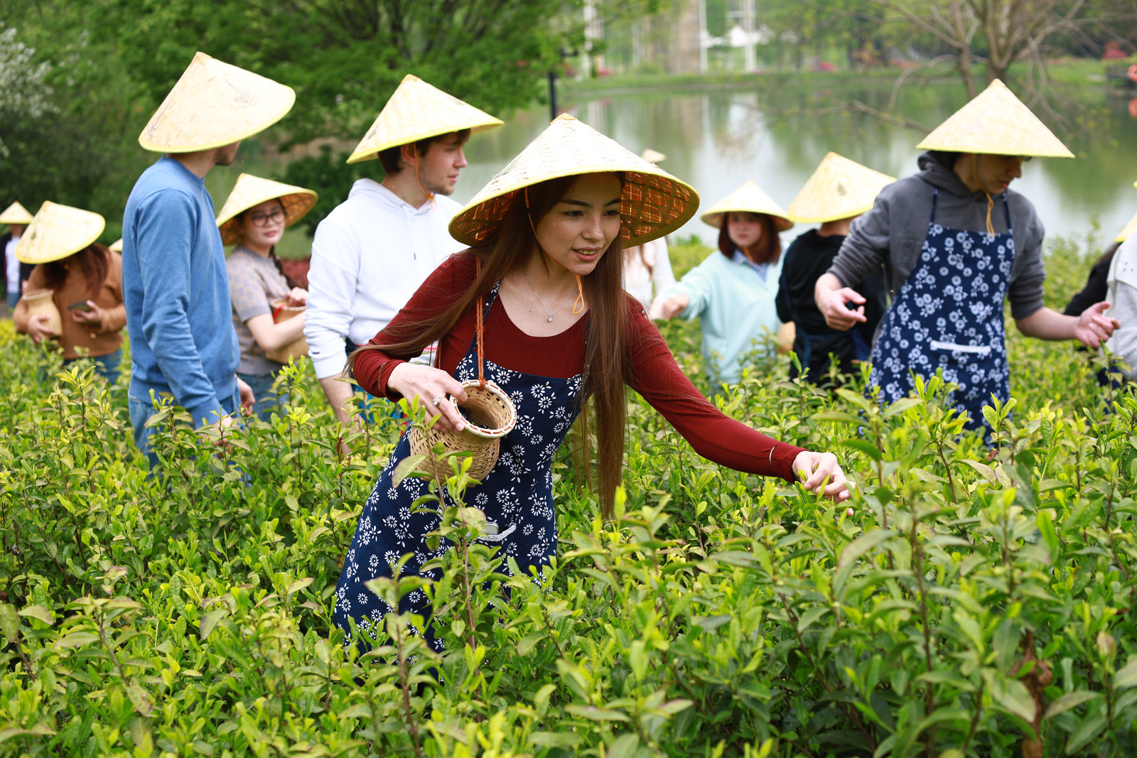 活动伊始,留学生们跟随讲解员游览园区,学习茶文化历史、茶园培育管理等知识,领略江南茶乡风貌。随后大家走进茶园,学习专业采茶技法,亲手采摘春茶,在劳作中感悟农耕匠心;并分组参与杀青、揉捻、烘干等全套制茶工序,直观感受传统制茶技艺的精妙。