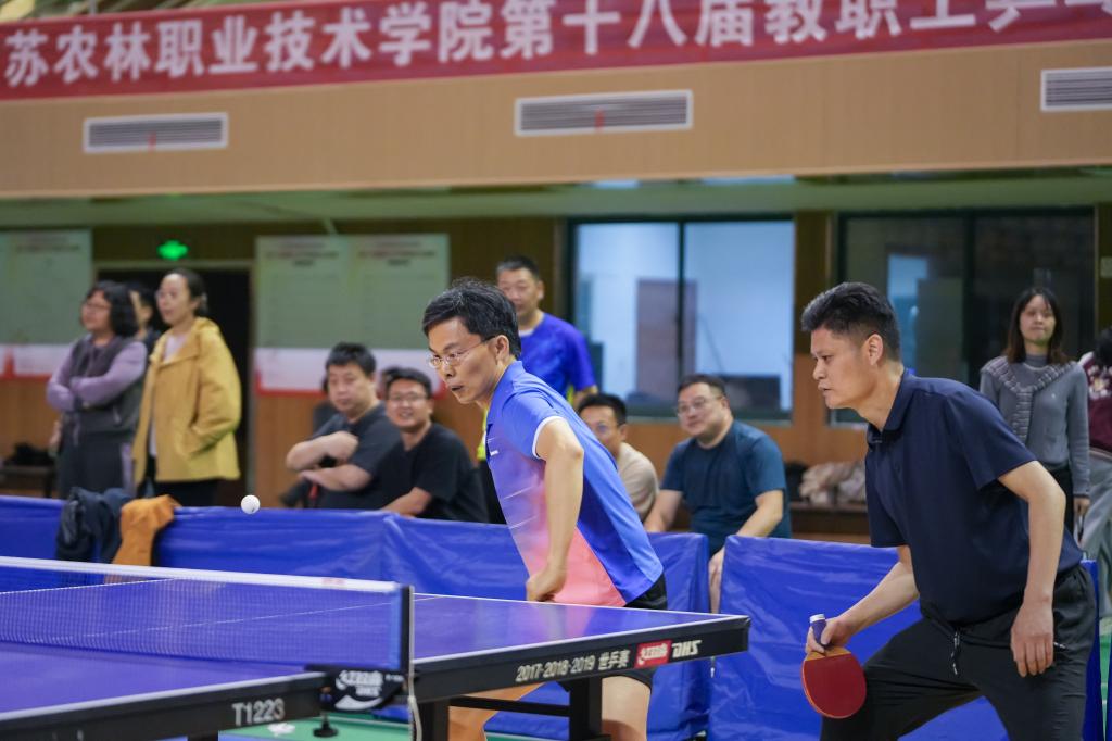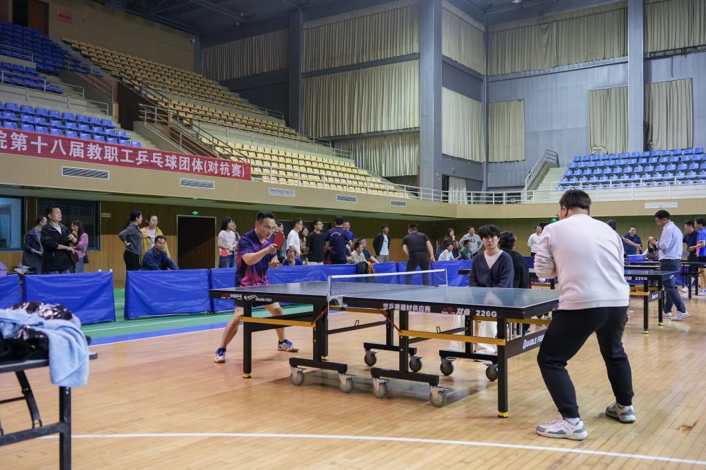 乒乓球团体赛一直是我校教职工传统比赛项目,本次比赛共有11个分工会及体育部组成的12支代表队参加。赛场上各参赛队员奋力拼搏、团结协作,为观众带来了一场场精彩绝伦的乒乓对决;体育部组织师生精心安排赛事,比赛秩序井然。